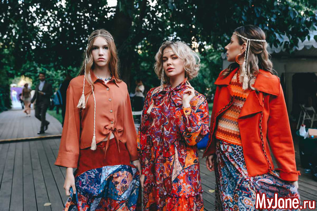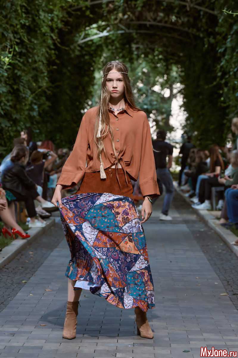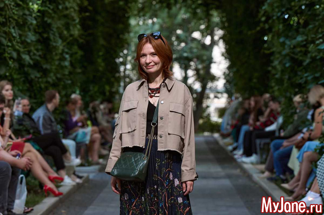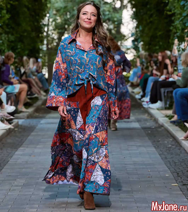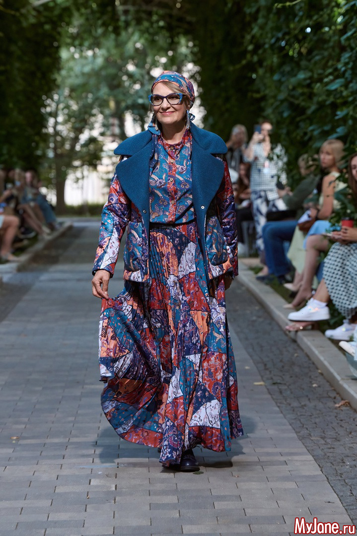 Закрывала показ Душегреи звезда фильма "Табор уходит в небо" Светлана Тома в роскошном платье со струящейся юбкой и укороченной куртке. Образ был дополнен актуальным в этом и предстоящем осеннем сезоне аксессуаром - косынкой и очками с оправой в тон наряду.