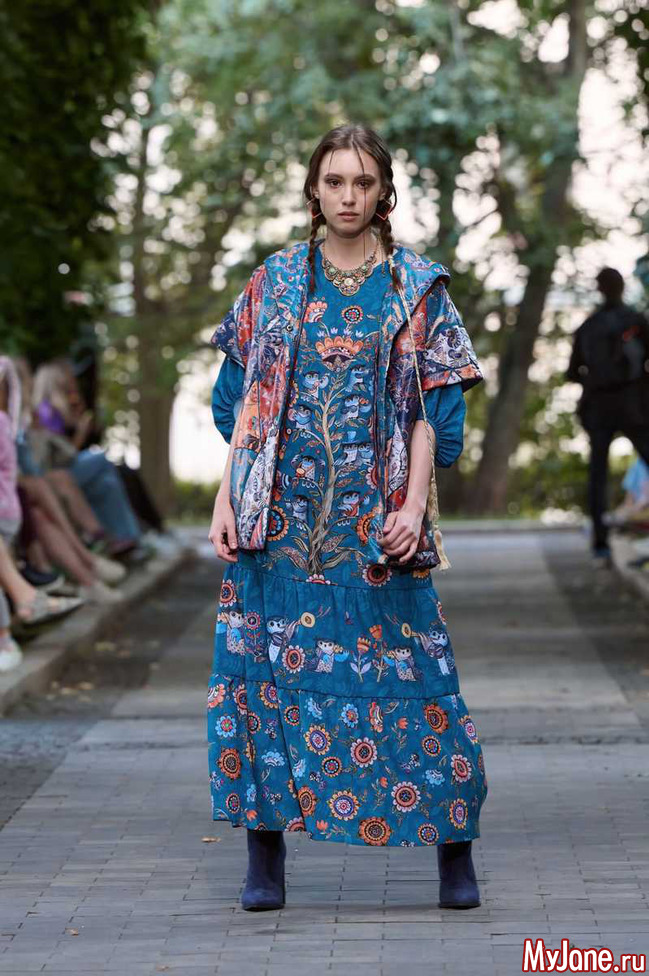 Открыла показ всеми любимая поэтесса Лариса Рубальская, которую ведущие фестиваля Фёдор Федотов и Олеся Константинова пригласили на сцену под громкие аплодисменты зрителей. Лариса Алексеевна для своего выхода выбрала яркое платье в стиле пэчворк из коллекции "Ветер с полей", дополнив образ украшениями из бирюзы. Поклонницы поэтессы отметили, что бирюзовый цвет ей очень к лицу. Лариса Рубальская прочитала свои стихи к романсу "Напрасные слова" и немного хулиганское стихотворение о том, что никогда не предугадаешь, где встретишь свою судьбу, задав настроение всему показу.