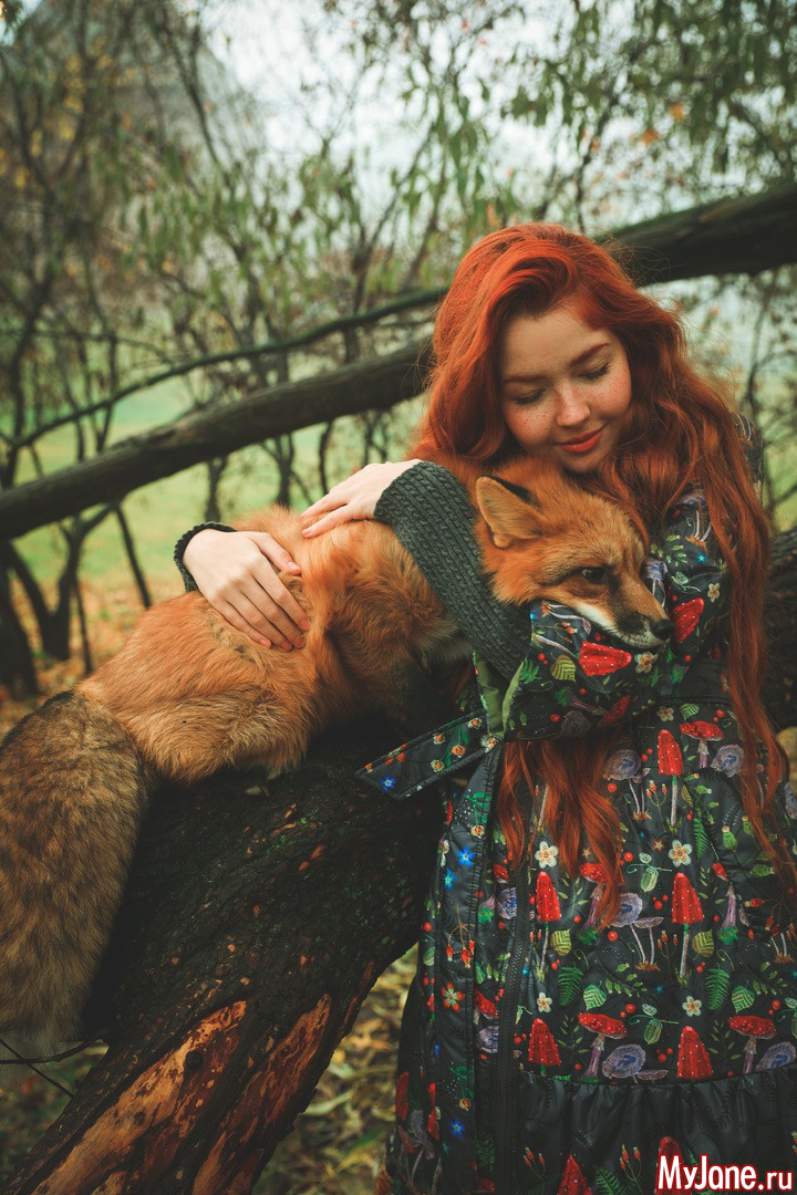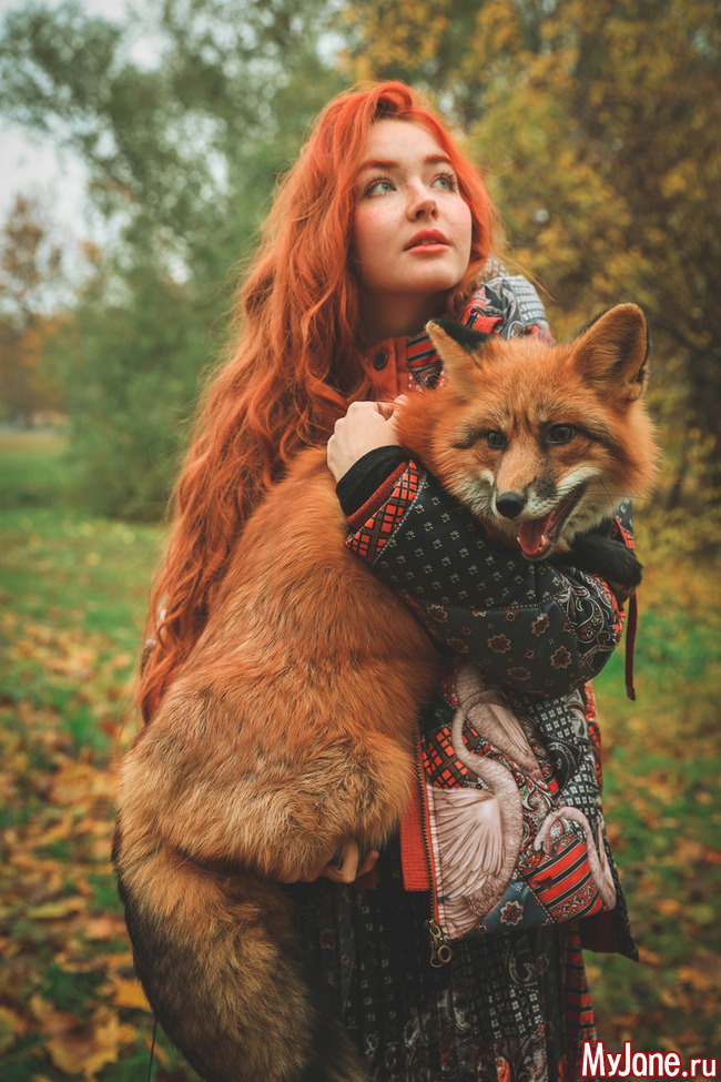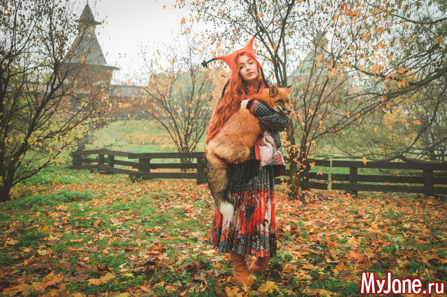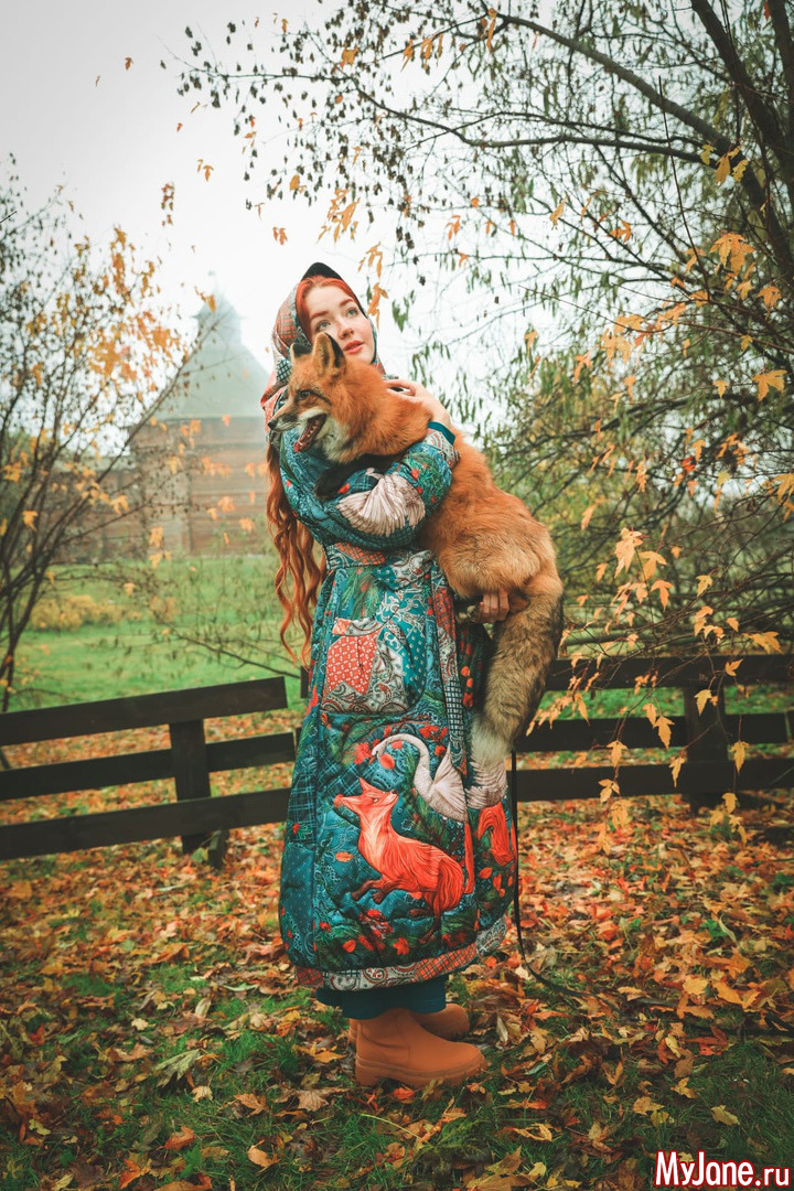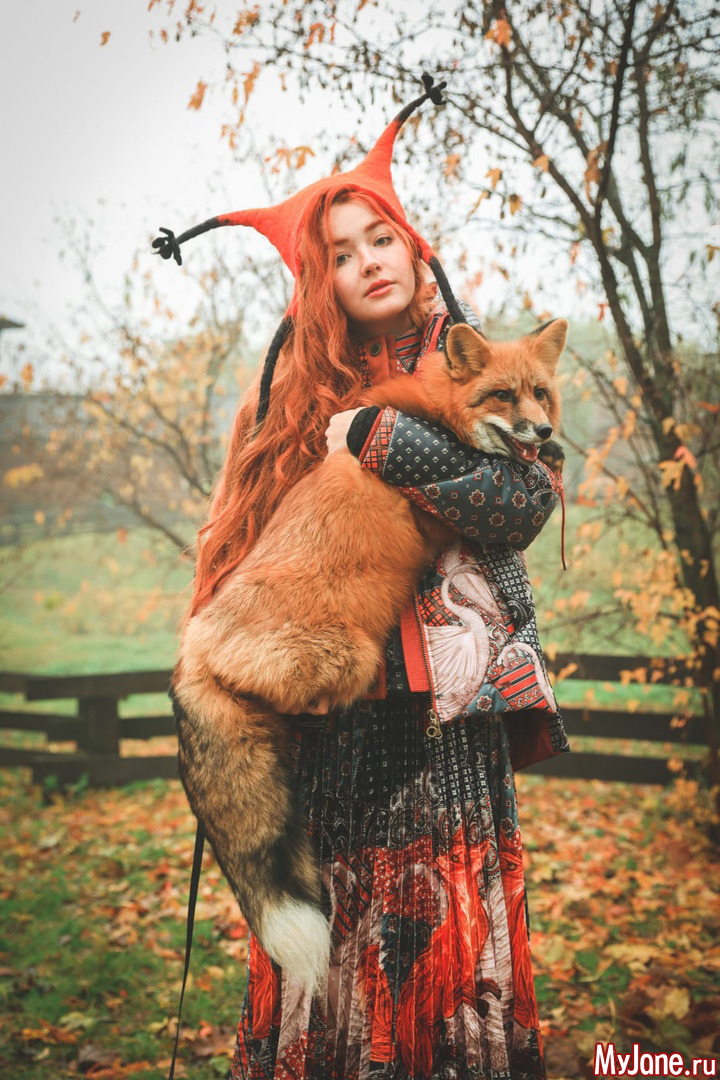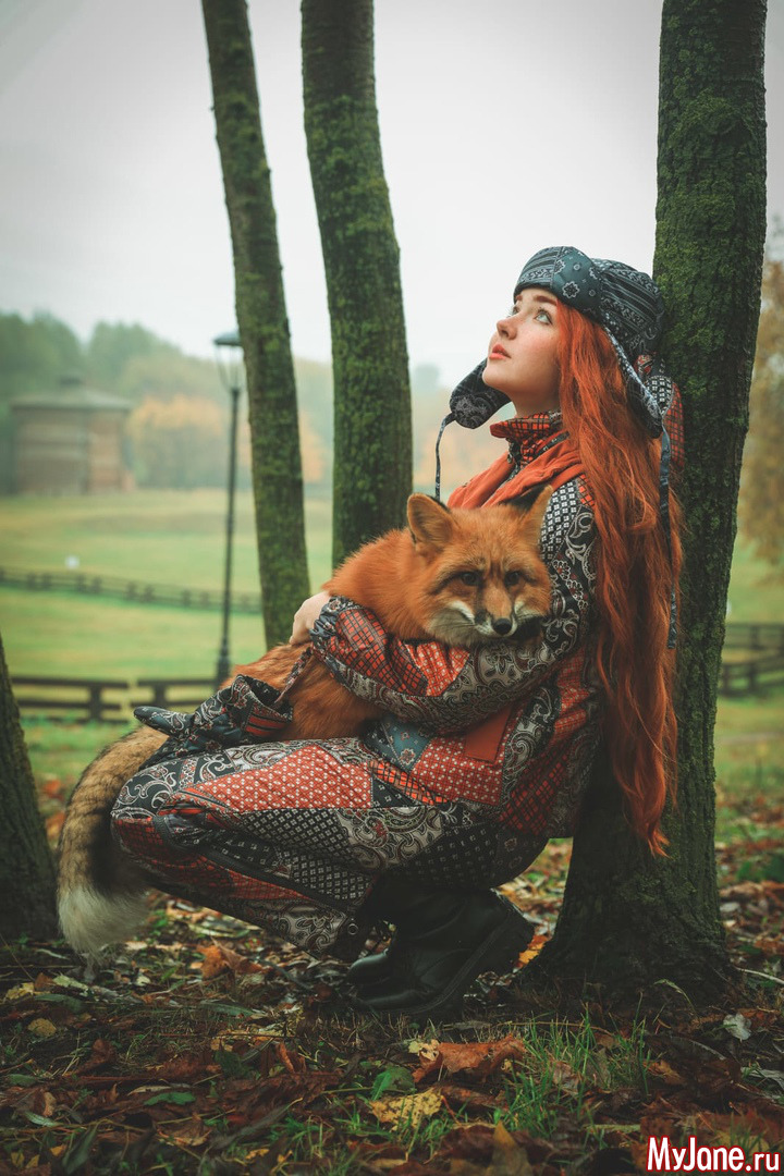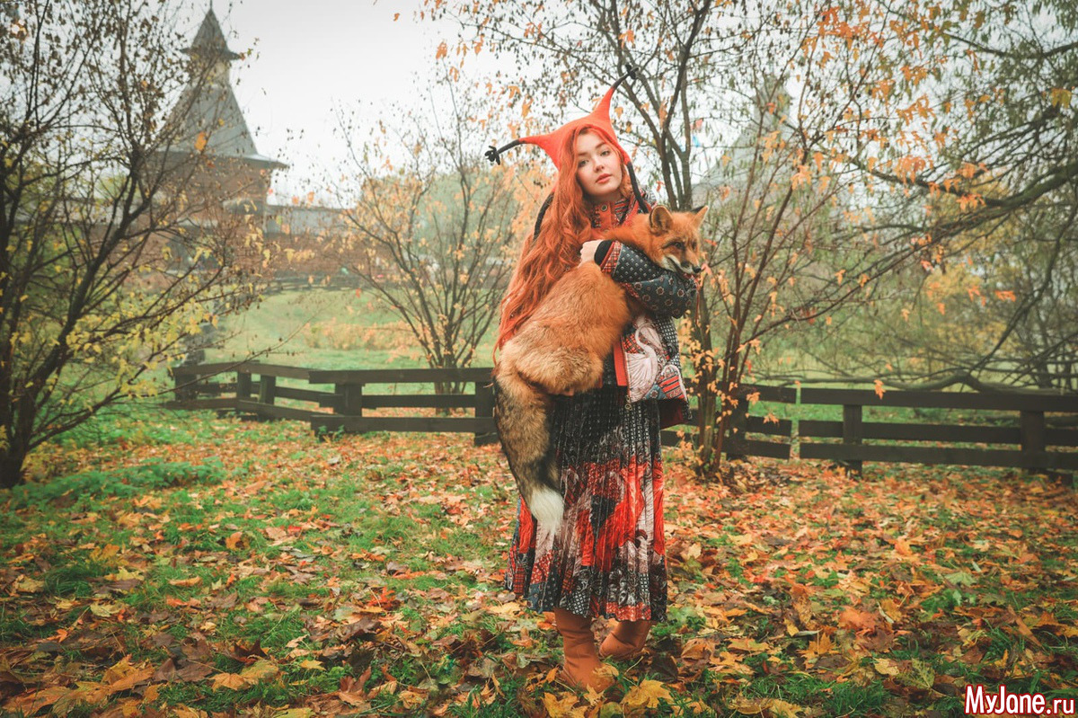 Модель Анна Ситкина в компании озорной и задорной живой лисички настолько органично и гармонично смотрится в дивных пейзажах золотой осени, что, кажется, прямо сейчас родится ещё одна русская народная сказка, под названием «Лиса и Лебедь» или «Отдых Лисы на поляне из мухоморов».