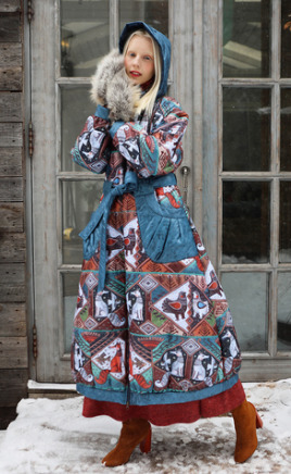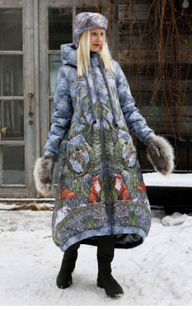 Модели с принтом «Лиса и Лебедь» представлены не только пальто и куртками разных фасонов, но и платьями, юбками, блузами, жилетами и джемперами. Образ можно дополнить акцентным шарфом, платком, варежками и шапкой, а также стёганой сумкой или авоськой. Есть пальто в данной расцветке и для юных модниц, мечтающих выглядеть также красиво, как мама. А придать сказочности домашнему интерьеру поможет скатерть «Лиса и Лебедь».