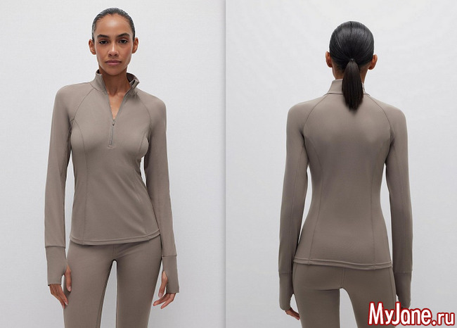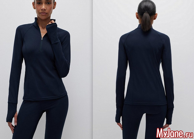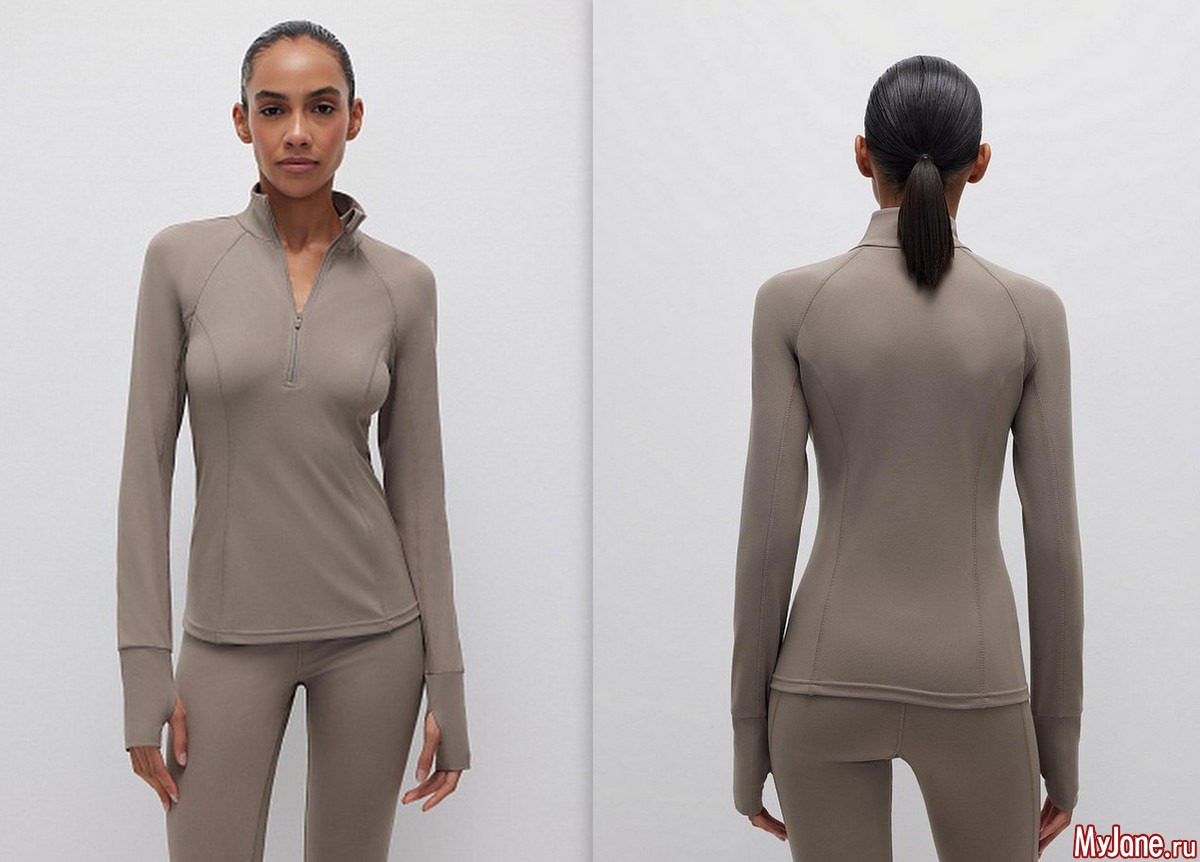 Спортивный лонгслив прилегающего силуэта выполнен из мягкой эластичной микрофибры. Изделие с короткой молнией на воротнике-стойке. Рукава дополнены манжетами, в которых предусмотрены прорези для большого пальца. Легинсы с высокой посадкой выполнены из мягкой эластичной микрофибры. Модель с широким поясом для комфортной посадки по фигуре. Для максимального комфорта швы на изделии плоские. Состав гигиеничен и экологичен - 78% полиэстер, 22% спандекс.