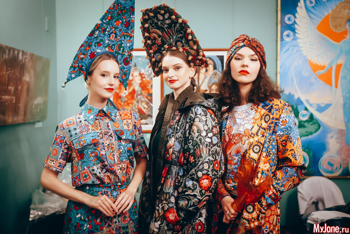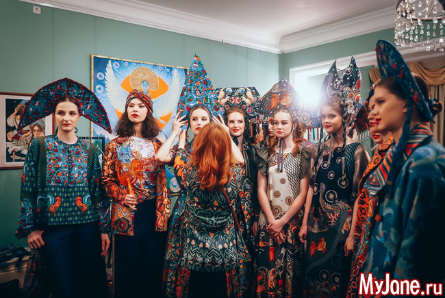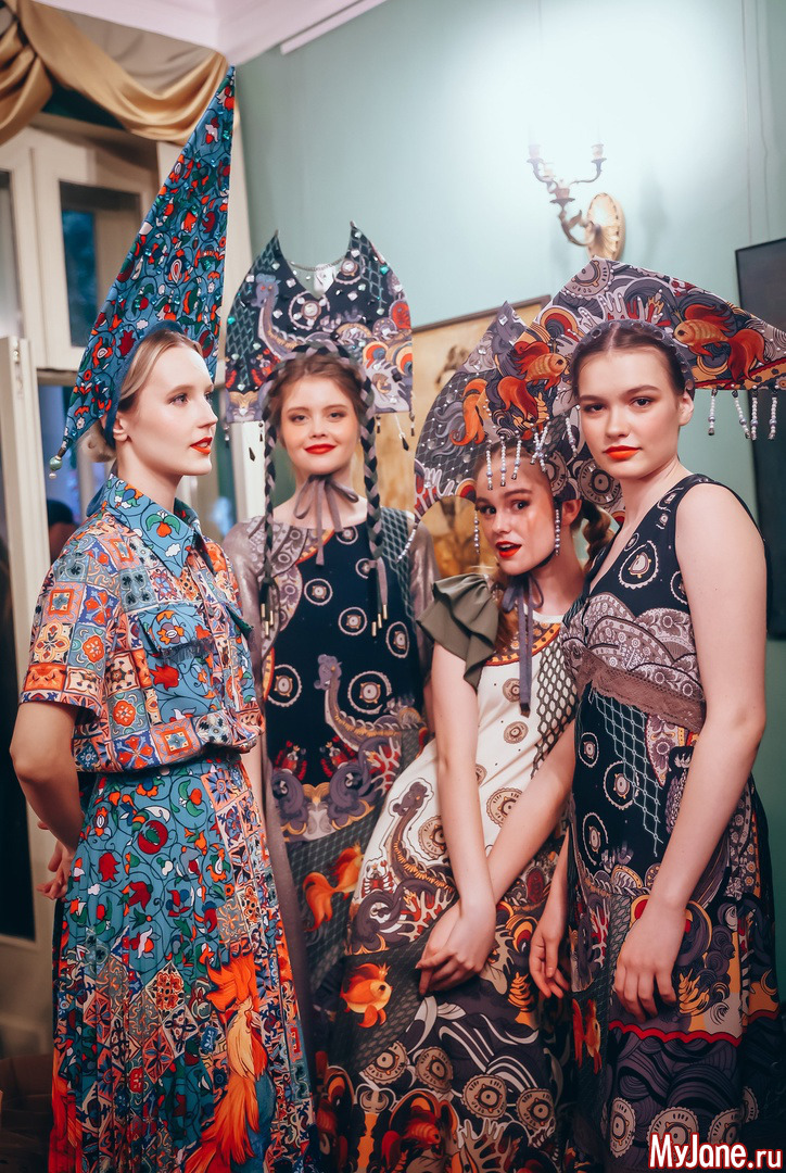 Коллекция «Золотой петушок» изобилует яркими и сочными цветовыми сочетаниями и фантазийными мотивами. Дополняли образы моделей эффектные головные уборы, которые основатель и дизайнер бренда Наталья Душегрея создала специально для показа.