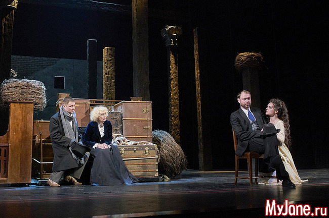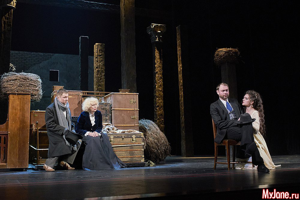 Сценография Мариуса Яцовскиса воплощает интерьеры середины девятнадцатого века – помпезная квартира Чебоксаровых, нанятая на последние деньги, контрастирует с маленькими аскетичными комнатами, арендуемыми экономным Васильковым. Основа декораций – монументальные колонны, которые венчают копны сена: это контраст не только деревенского и городского быта, но и принципиальная разница менталитетов.