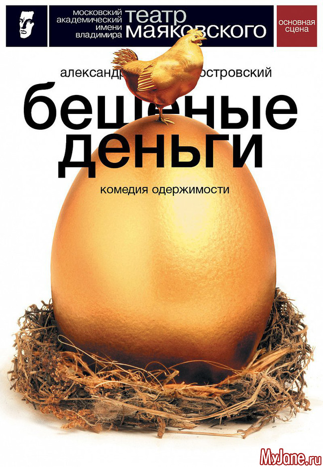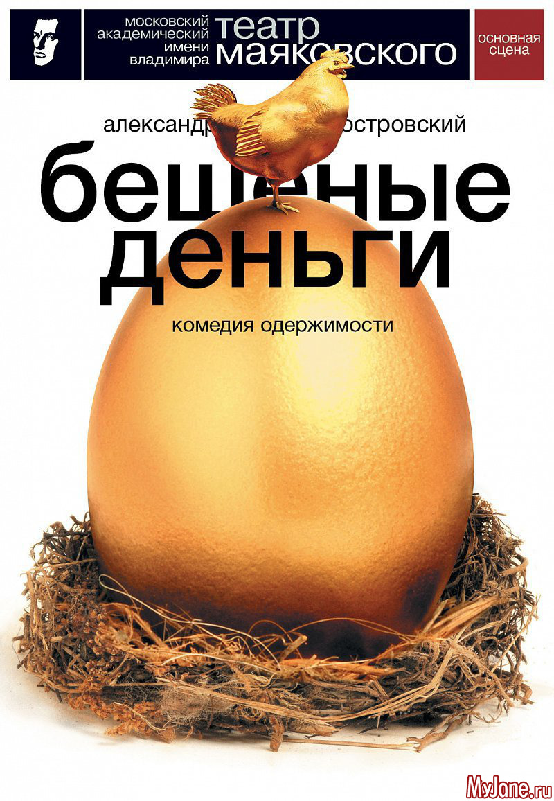 На программке, которая в традициях Маяковки изобилует образными символами, изображено золотое яйцо, которое венчает золотая курица. Метафора с курицей, несущей «золотые яйца», очень аллегорично синхронизируется с драматургией действия: даже самое драгоценное яйцо может разбиться, но курица сможет снести новое.