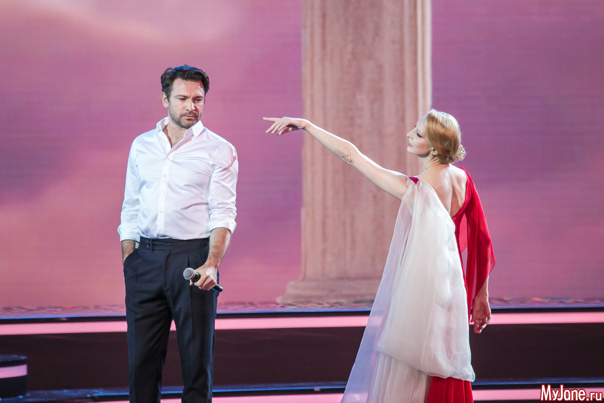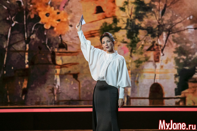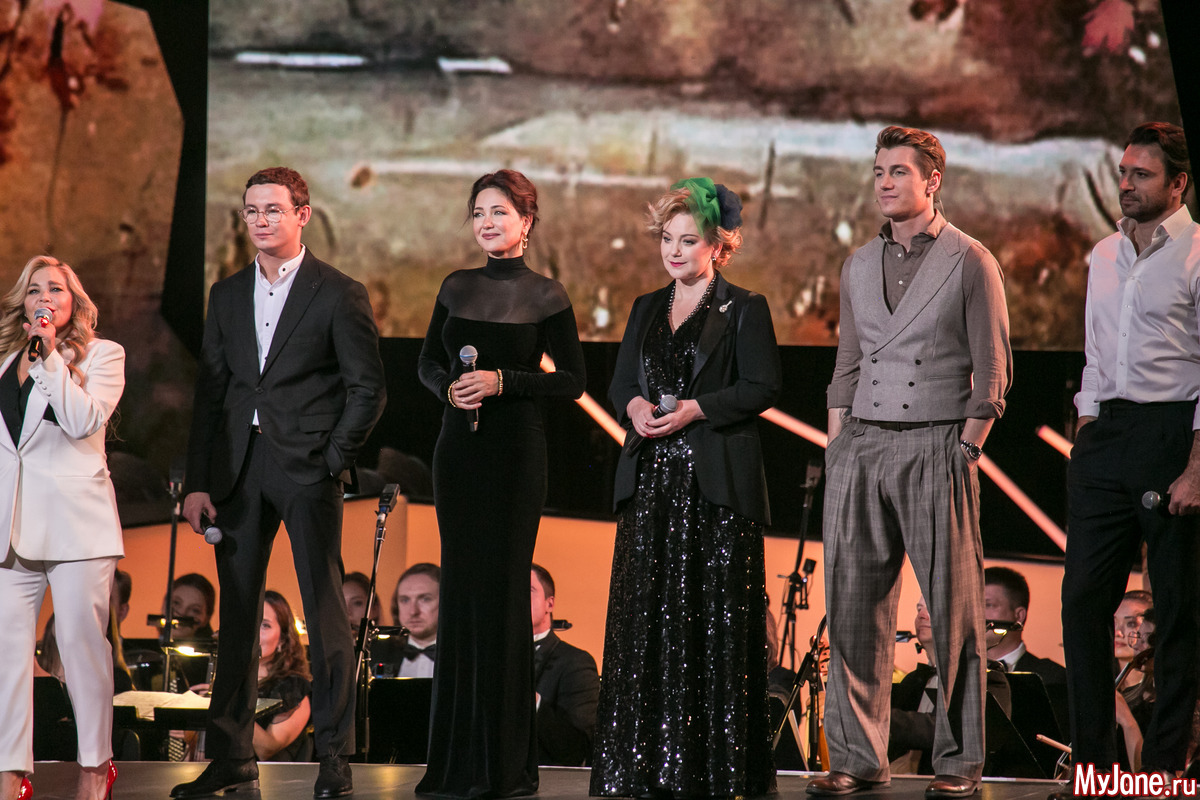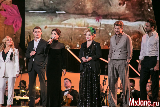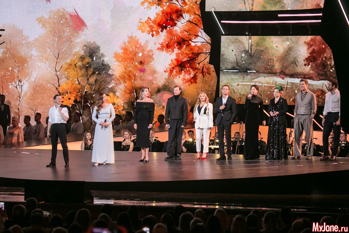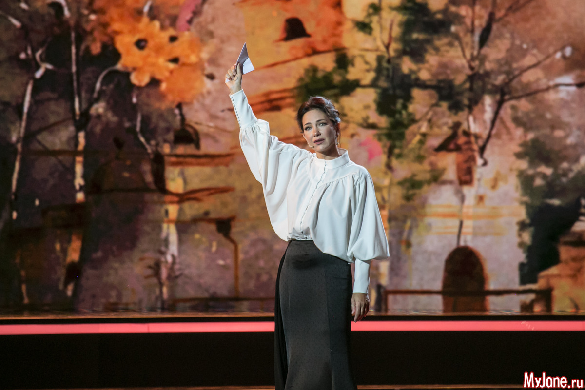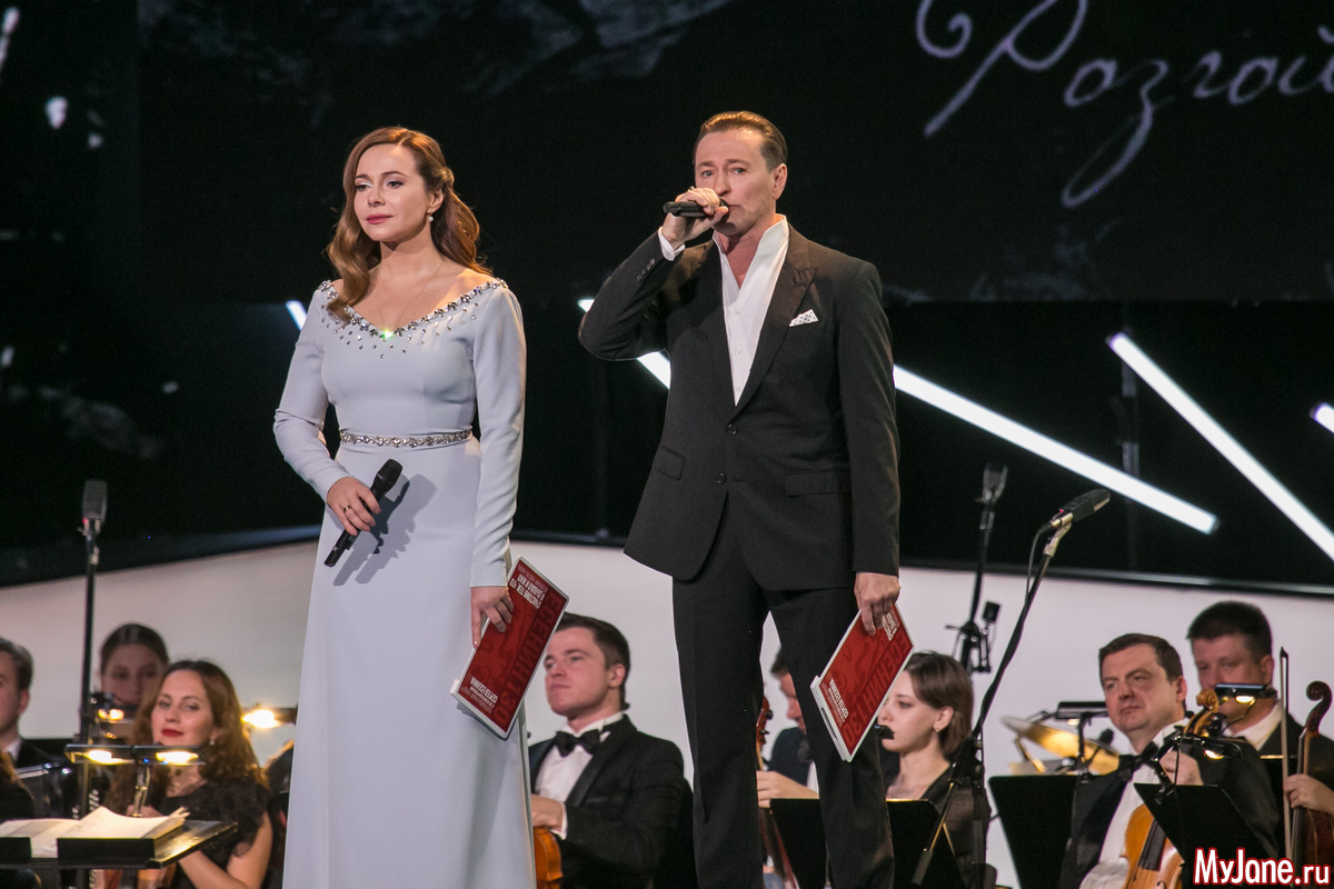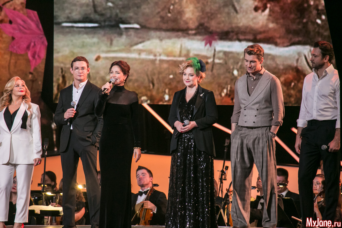 Женственная и нежная ведущая вечера Екатерина Гусева прочитала в дуэте с Сергеем Безруковым стихотворение «Дорогая, сядем рядом» и философски спела знаменитую песню «Клен ты мой опавший».