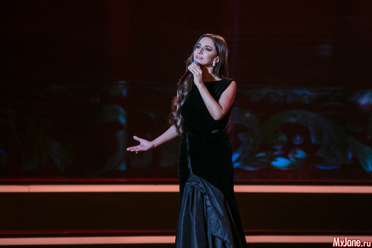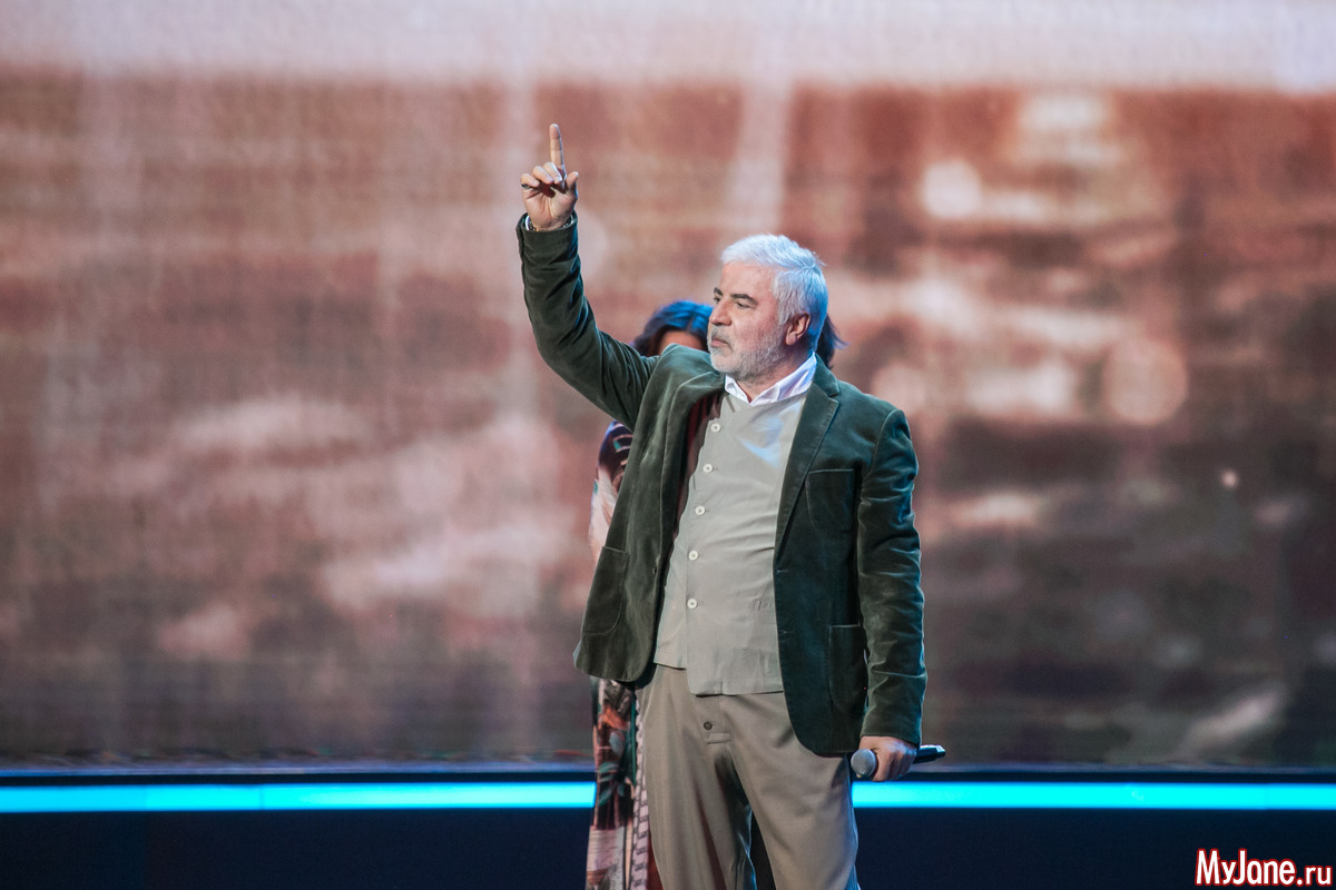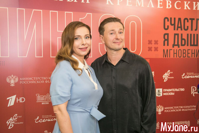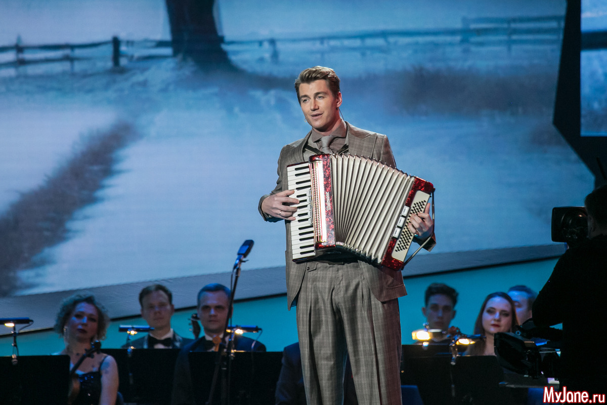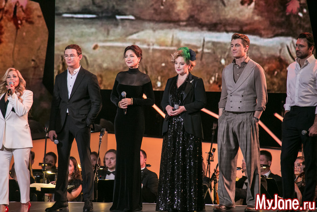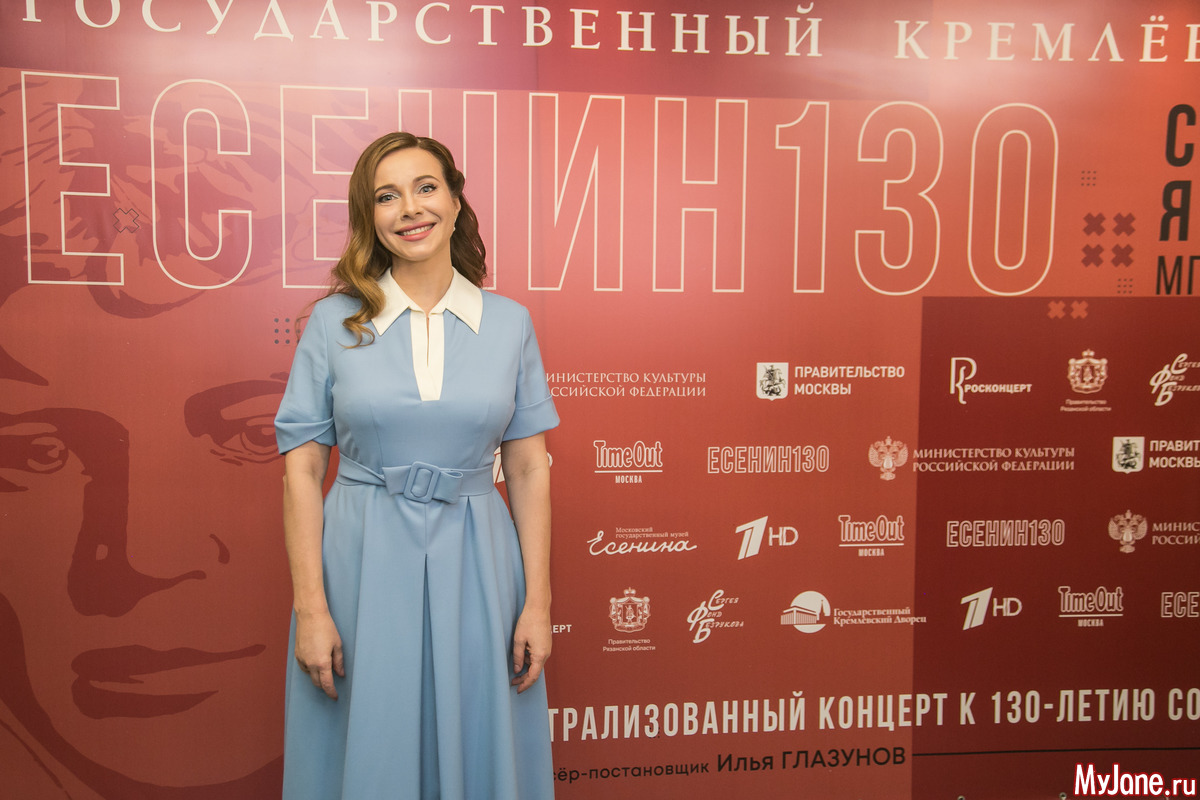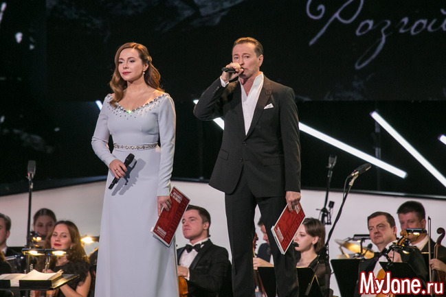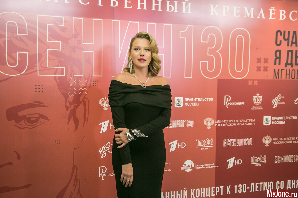Женственная и нежная ведущая вечера Екатерина Гусева прочитала в дуэте с Сергеем Безруковым стихотворение «Дорогая, сядем рядом» и философски спела знаменитую песню «Клен ты мой опавший».