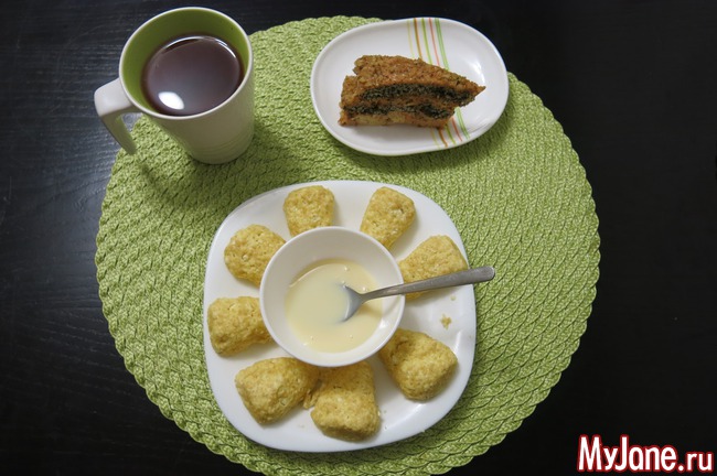 ленивые вареники из творога с отрубями на пару, сгущенка, кусочек тортика (последний), чай