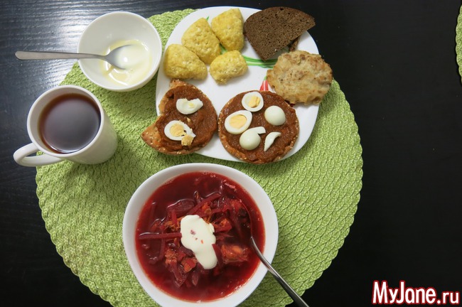 борщ диетический + сметана, кусочек хлеба, отбивная, два бутера (хлебец+икра кабачковая+яйцо перепелиное), ленивые вареники, сгущенка, чай