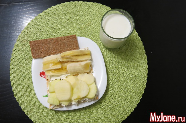два бутера (хлебец+творог+яблоко\банан), кефир, 1 крисп