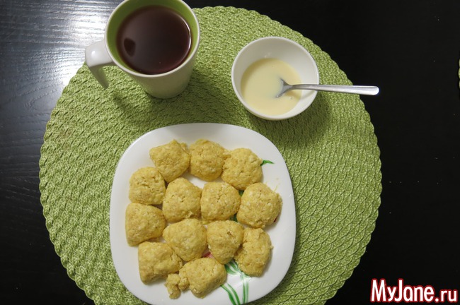 ленивые вареники из творога с отрубями на пару, сгущенка, чай