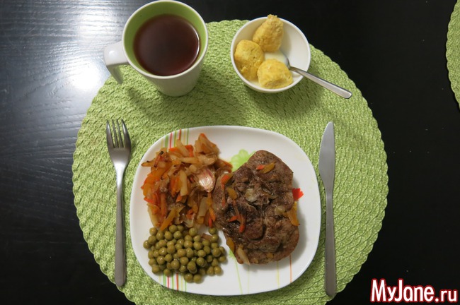 стейк из голени индейки с тушенными овощами, горошек консервированный, остатки вареников, ложка сгущенки, чай