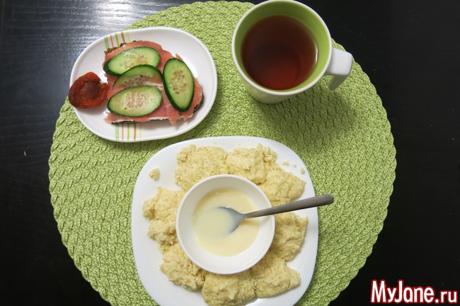 ленивые вареники из творога со сгущенкой, бутер (хлеб+творог+полендвица+огурец), 1 урюк, чай