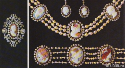 Папюра - тиара, колье, два браслета и булавки (?). Автор шедевра — ювелирный гений Мари-Этьен Нито (Nitot). Дата создания - примерно 1809 год. Для любимой супруги император Наполеон заказал у придворного ювелира тиару с камеями, которые тогда пользовались особенной популярностью. Для изготовления тиары из королевской сокровищницы были выделены старинные и античные камеи. Тиару преподнесли в дар Жозефине. Но, по какой-то причине императрица ею почти не пользовалась. А передала тиару дочери Гортензии. На этом следовало бы закончить историю, но...