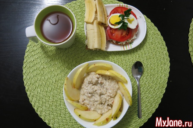 овсянка с яблоком, бутер (хлебец+творог+полендвица+помидор+1\2 яйцо), бутер (хлебец+творог+банан), чай