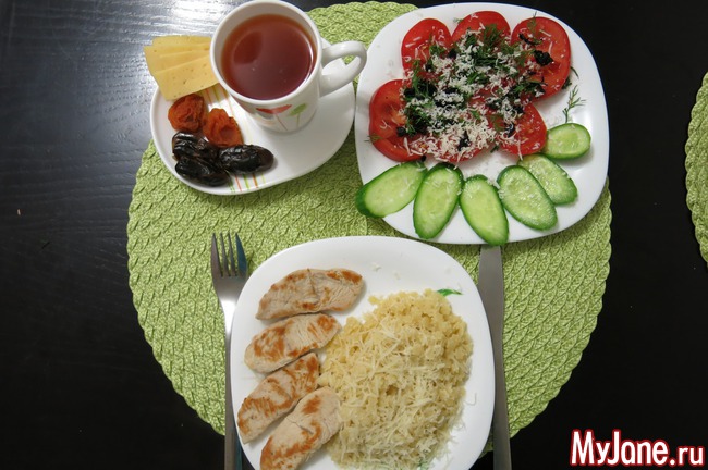 индейка, макароны, помидоры, огурцы, сыр, два финика, урюк, чай