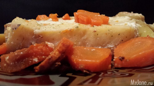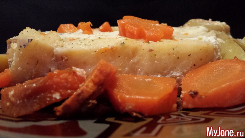 запекла какую то белую рыбу, предполагаю, что филе трески нашлось в морозилке, просто с овощами - морковью и картофелем кусками.