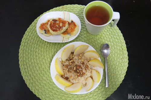 овсянка с гр. рехом и яблоком, три сырника, чай