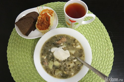 суп щавелевый, сметана, хлеб, два сырника, чай