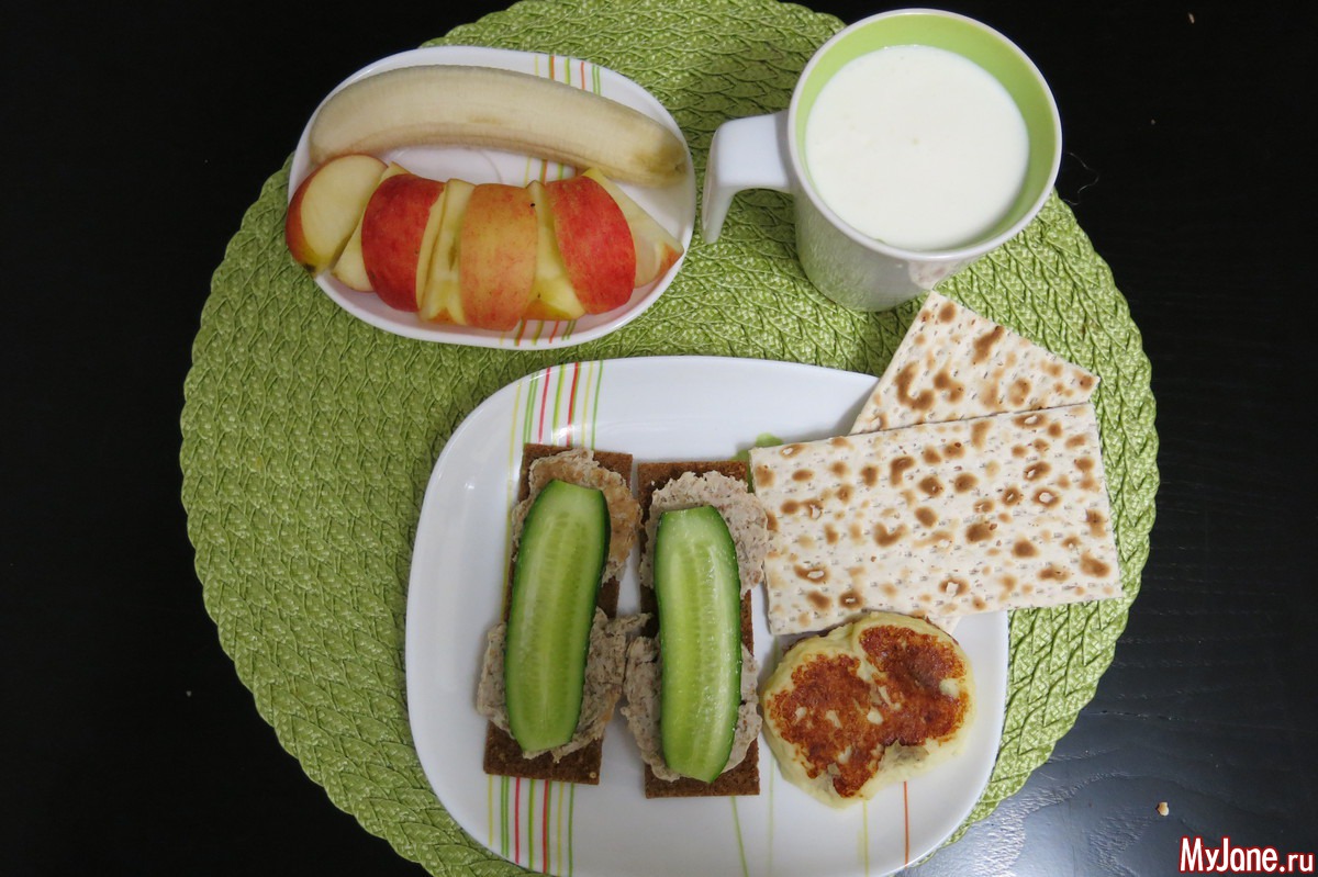 два бутера (хлебец, котлета из индейки, огурец), один сырник, два хлебца, кефир, яблоко, банан