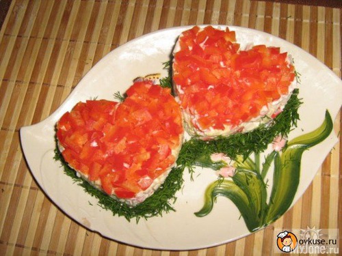 Вот, я сегодня набрела на вот такой салат. Просто, но какое приятное оформление! Принесла к нам, в норку. В копилку. Правильно я сделала?)))