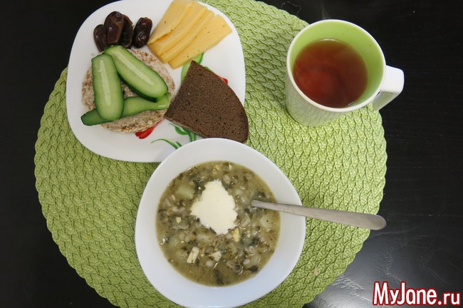 суп щавелевый со сметаной, хлеб, бутер (хлебец+котлета из индейки+огурец), сыр, финики, чай