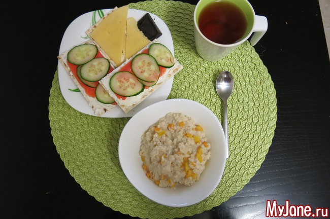овсянка с тыквой, два бутера с кр. рыбой (хлебец+рикотта+красная рыба+огурец), один хлебец с сыром, одна долька горького шоколада, чай