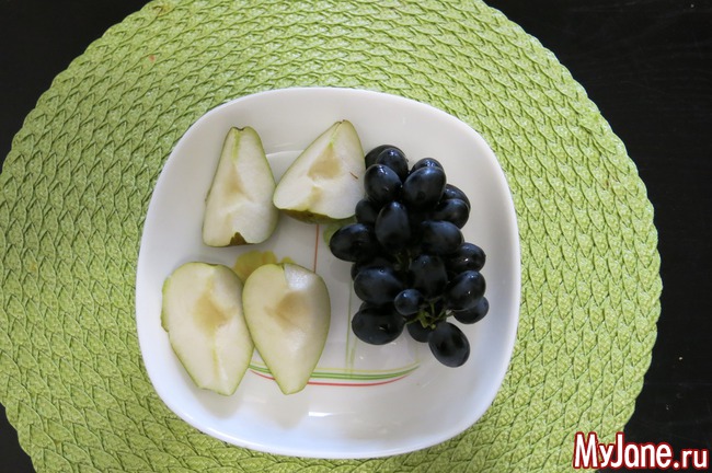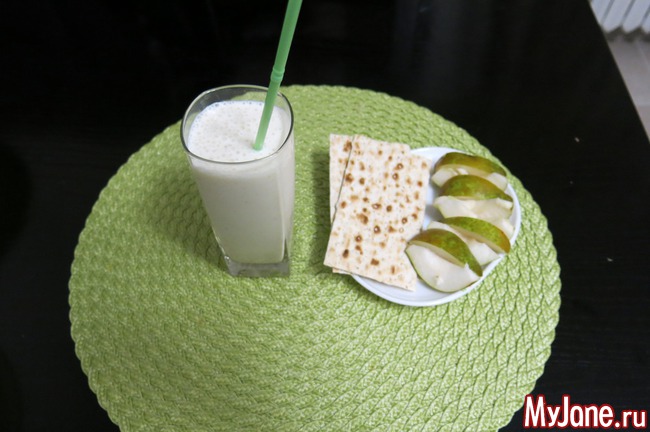 коктейль (баночка мягкого творога, кефир, банан), два хлебца, груша