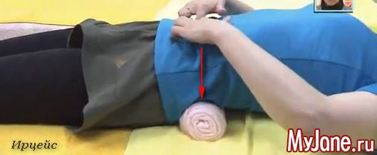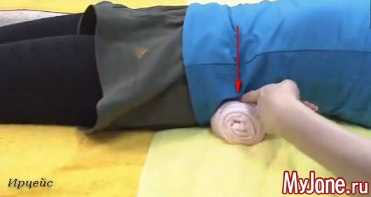 Сесть на достаточно твердую горизонтальную поверхность (мягкая кровать не подойдет, лучше лежать на кушетке, массажном столе или просто туристическом коврике на полу), положить свёрнутый валик сразу за ягодицами. Аккуратно опускаемся на спину, придерживая валик руками так, чтобы он оказался поперек тела под поясницей — ровно под пупком! Это важно! Проверяем правильность выбранной позы.