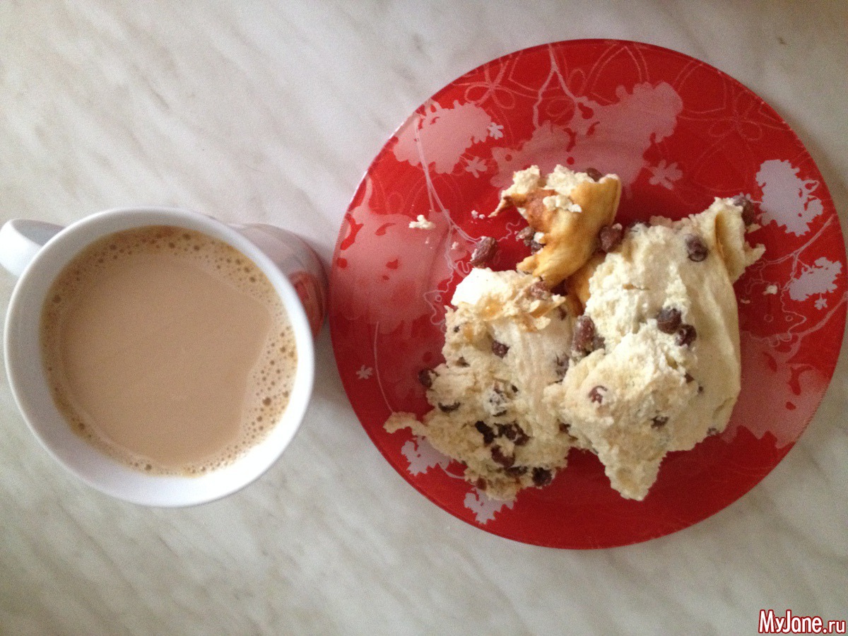 Пьяная (изюм замачивала в коньяке) запеканка с изюмом + кофе с молоком. Вид у запеканки конечно так себе (не удачно достала из мультиварки), но на вкус очень даже.