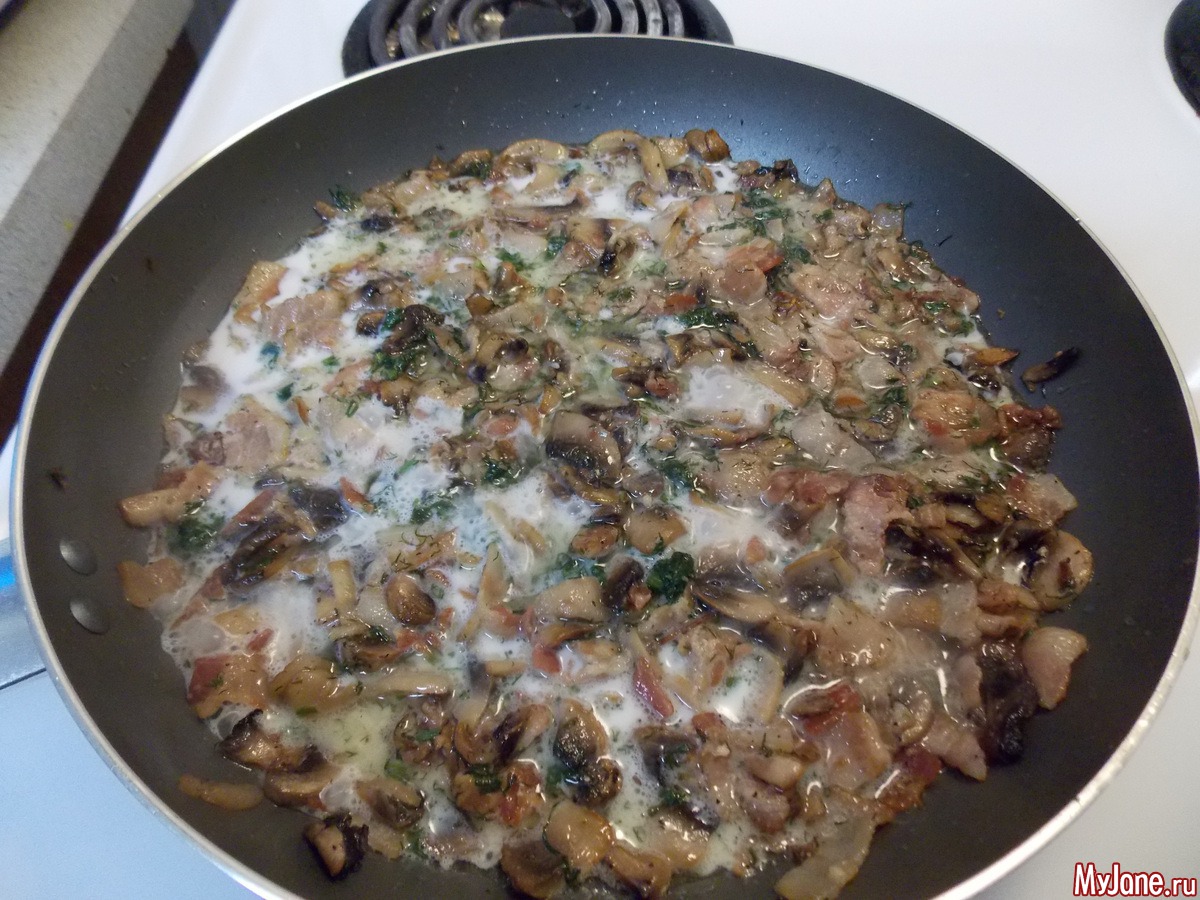 обжариваем, добавляем зелень, чеснок, и вливаем молоко.