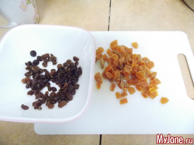 Замачиваем изюм и курагу в кипятке на несколько минут и мелко режем