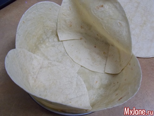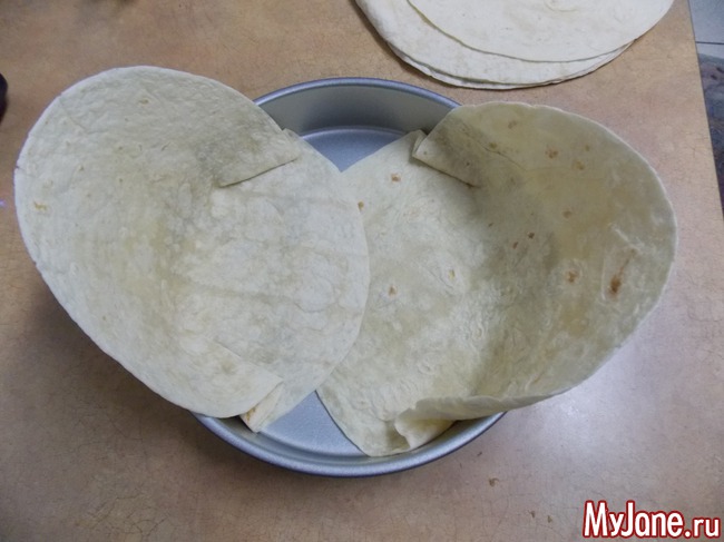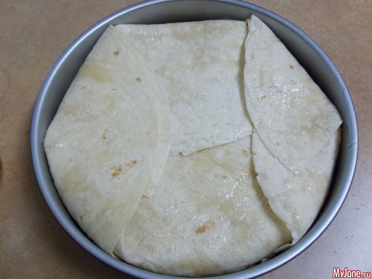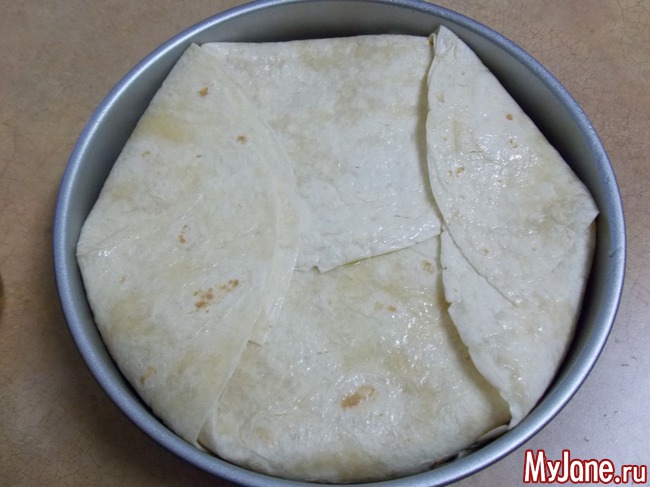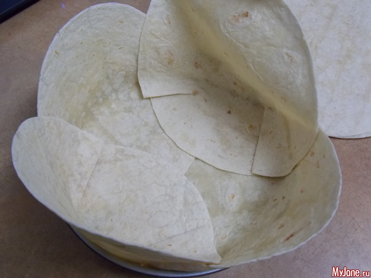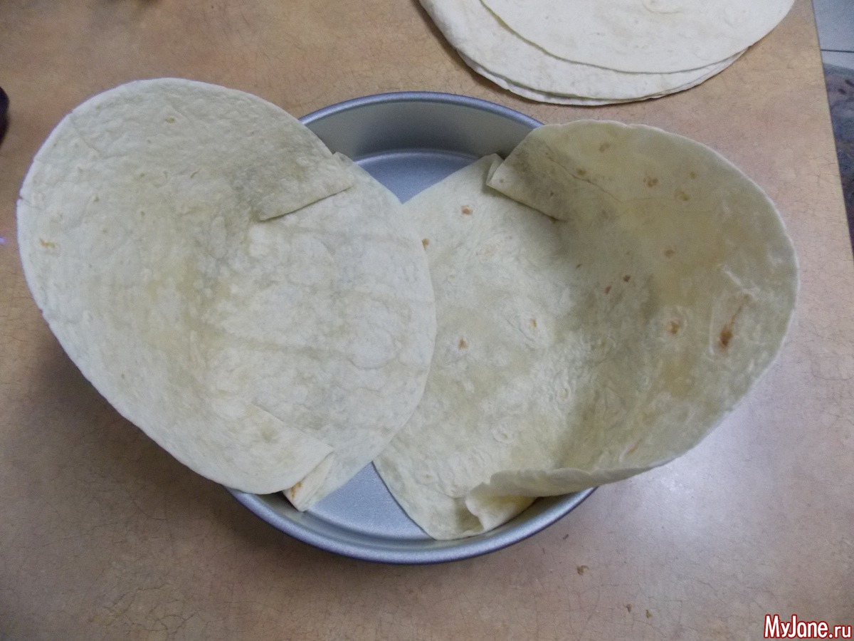 Берем 4 тортиллы укладываем их в форму