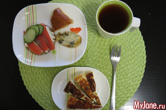 запеканка творожная, бутер с кр. рыбой (хлебец+рикотта+красная рыба+огурец), 1\2 пирожка с капустой (это подруга дала с собой вчера), маленький кусочек бананового кекса (это я пекла мужу, но блин бананы потемнели и выглядят не очень, но на вкус ок), чай