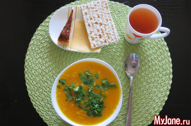 тыквенный суп-пюре с курицей, два хлебца, кусочек сыра, кусочек запеканки, чай