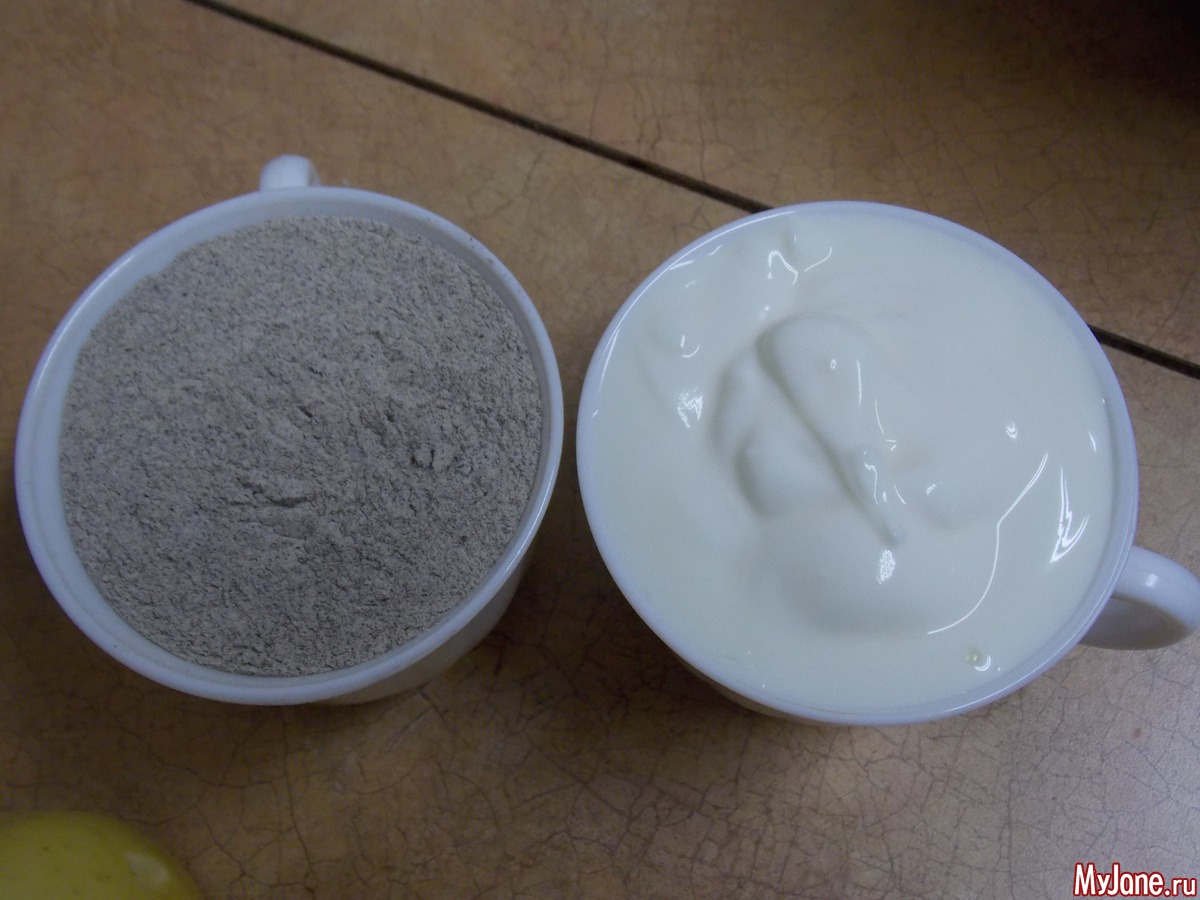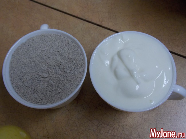 смешивает муку и йогурт с яйцами, чуть взбивает, добавляем разрыхлителя две ч. ложки и чуть соли и два пакетика стевии.