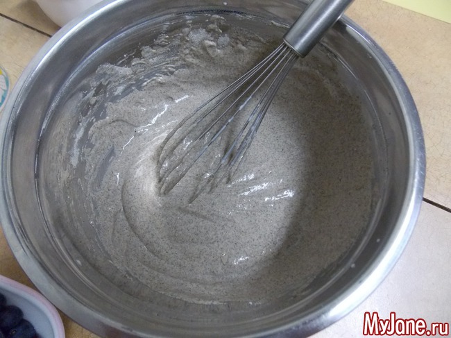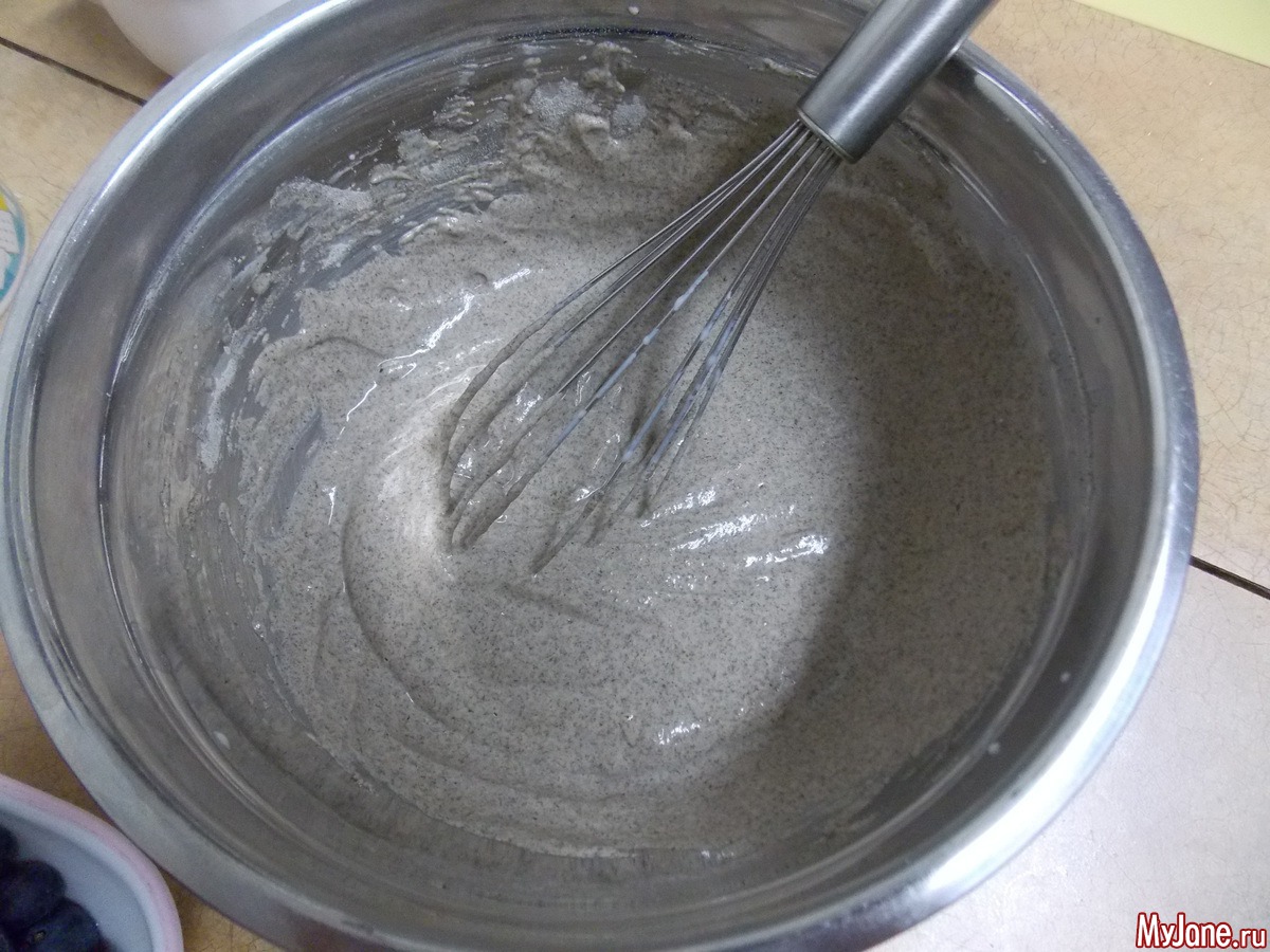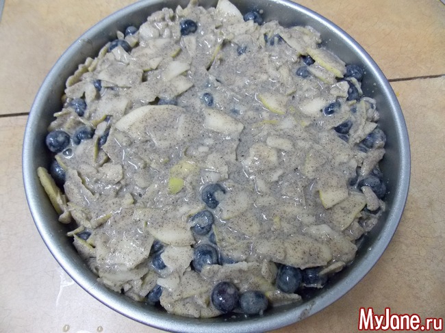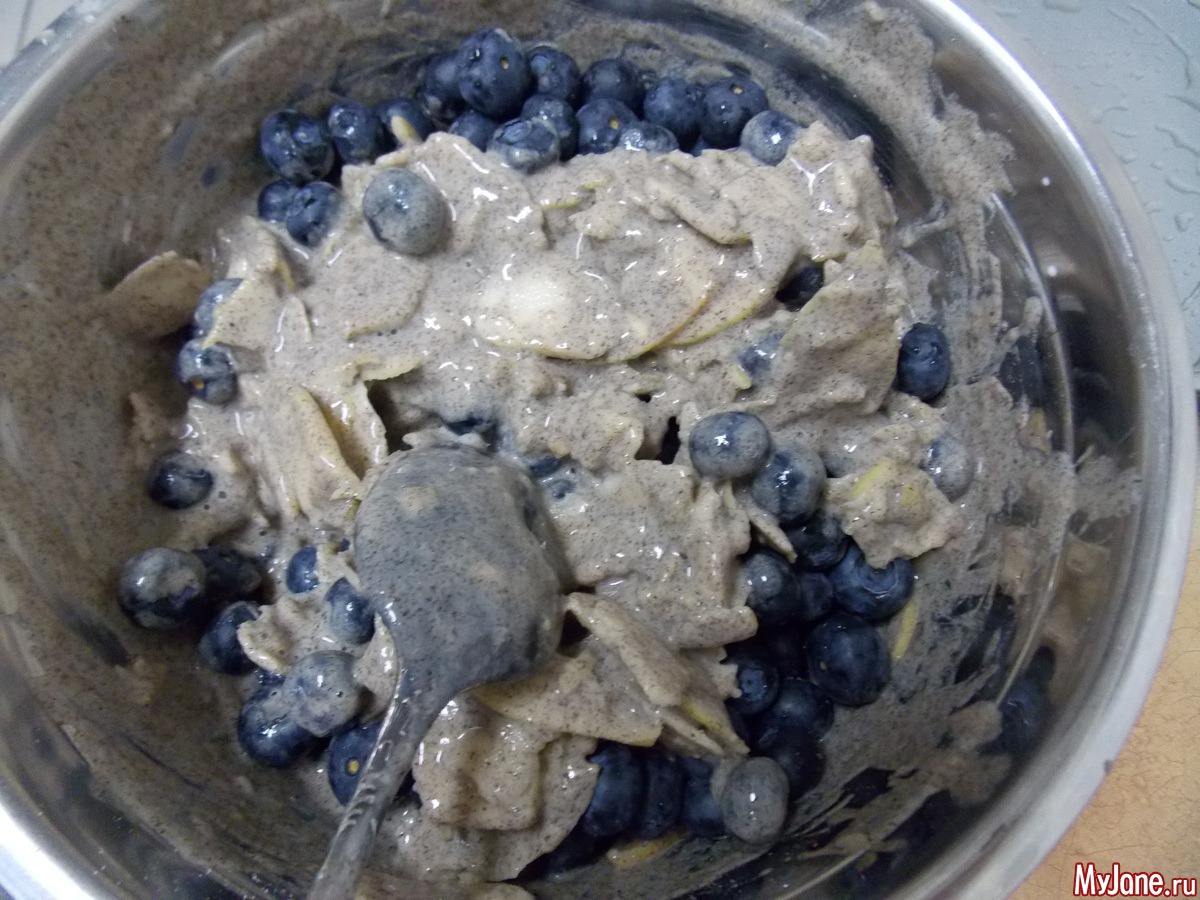 когда тесто станет равномерным, как для блинов, высыпаем яблоки и чернику и осторожно перемешиваем, чтобы ягоды не повредились (мне пришлось 50 гр воды доюавить, тесто было не достаточно жидкое)