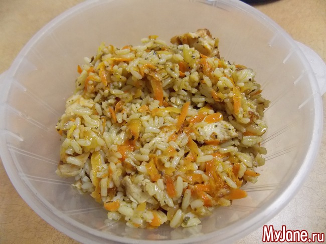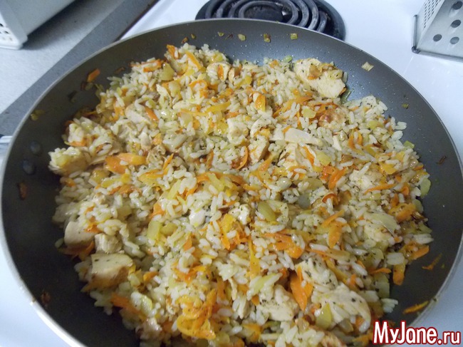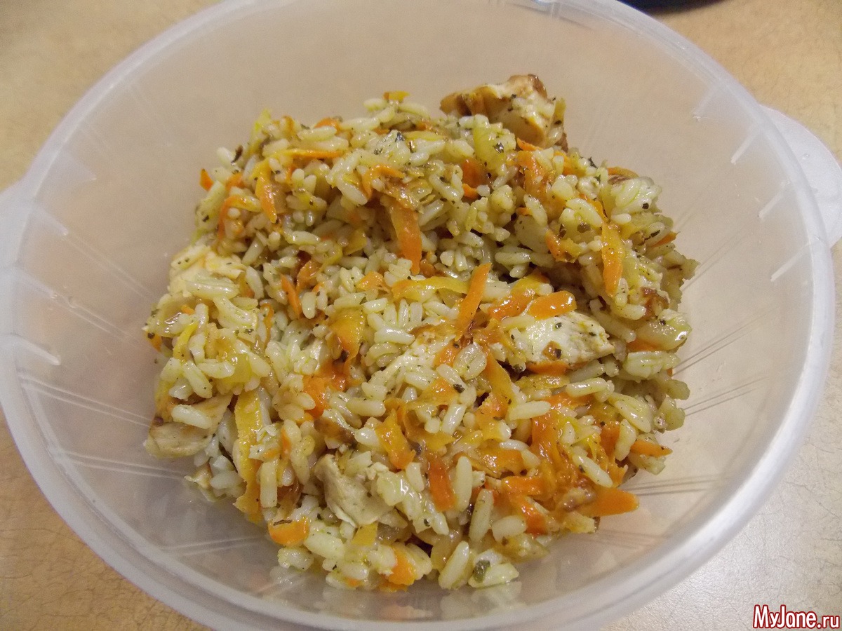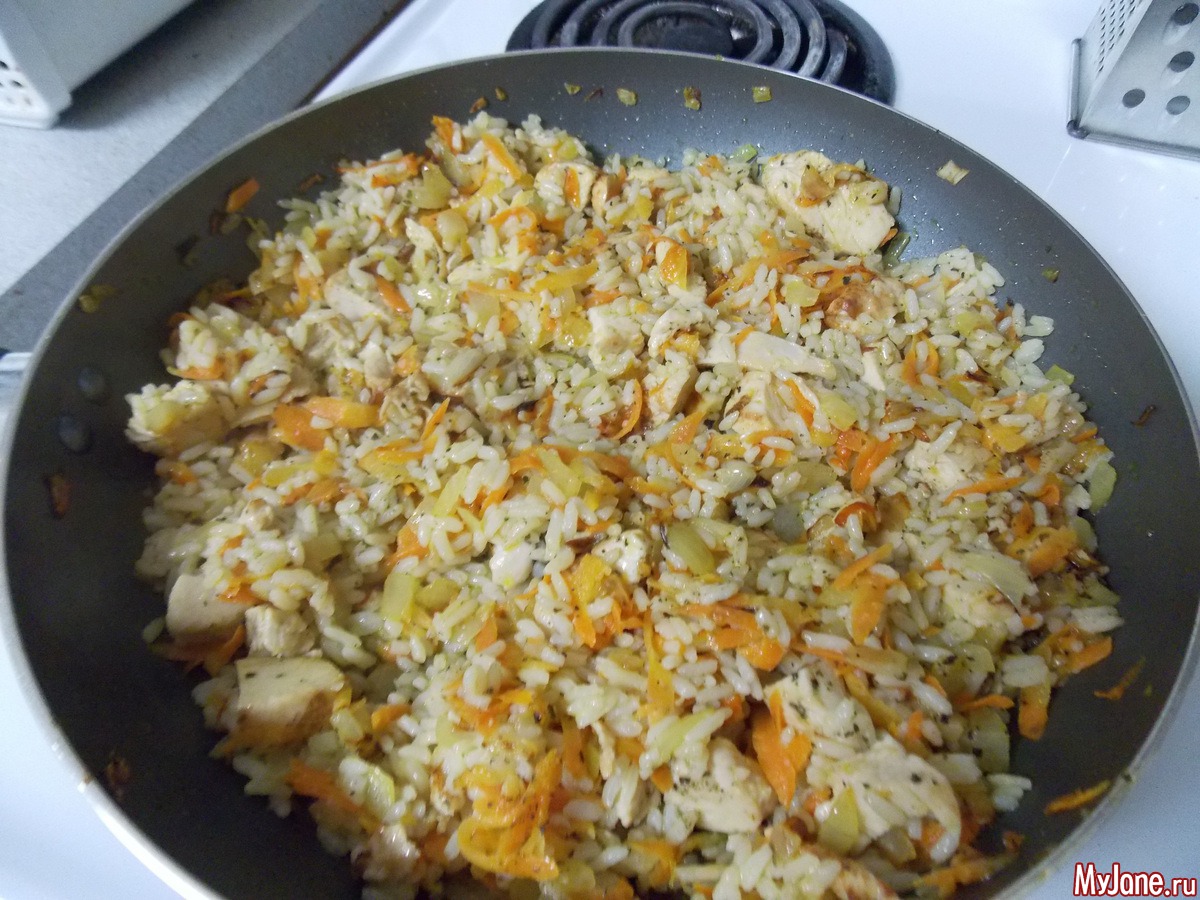 Так что я просто обжарил пару морковок и большую луковицу на 30 гр оливкового масла, порезал куриную грудку к моркови и луку, чуть обжарил и добавил уже готовый рис. много специй и пара минут под крышкой. А-ля плов готов.