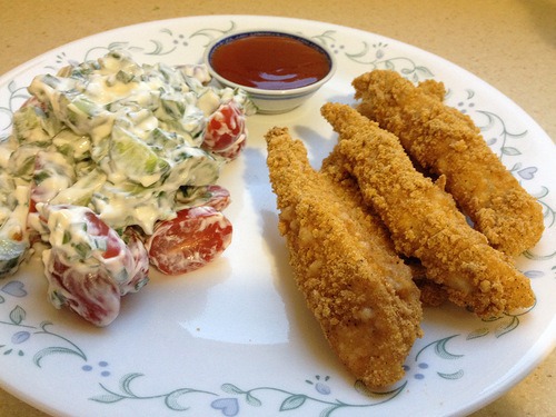 Кать, ещё один быстрый рецепт для тебя куриные грудки нарезать на полоски, на 2 грудки, 2 яйца взбить вилкой, 2 пакетика shake and bake куриные полоски обмакнуть в яйце, обвалять в shake and bake на противень и в разогретую до 400 по фаренгейту духовку на 20 минут. они похожи на куриные грудки во фритюре в фаст фудах, но много здоровее. plum или sweet and sour соус макать их можно купить в любом продуктовом. я часто делаю с салатом и муж их очень любит.