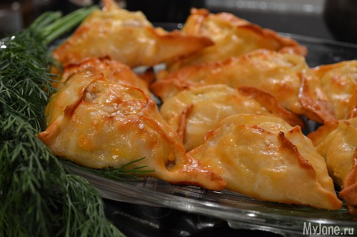 В момент полуготовности в отверстия вливается крепкий мясной бульон и смазываются эчпочмаки яичным желтком.