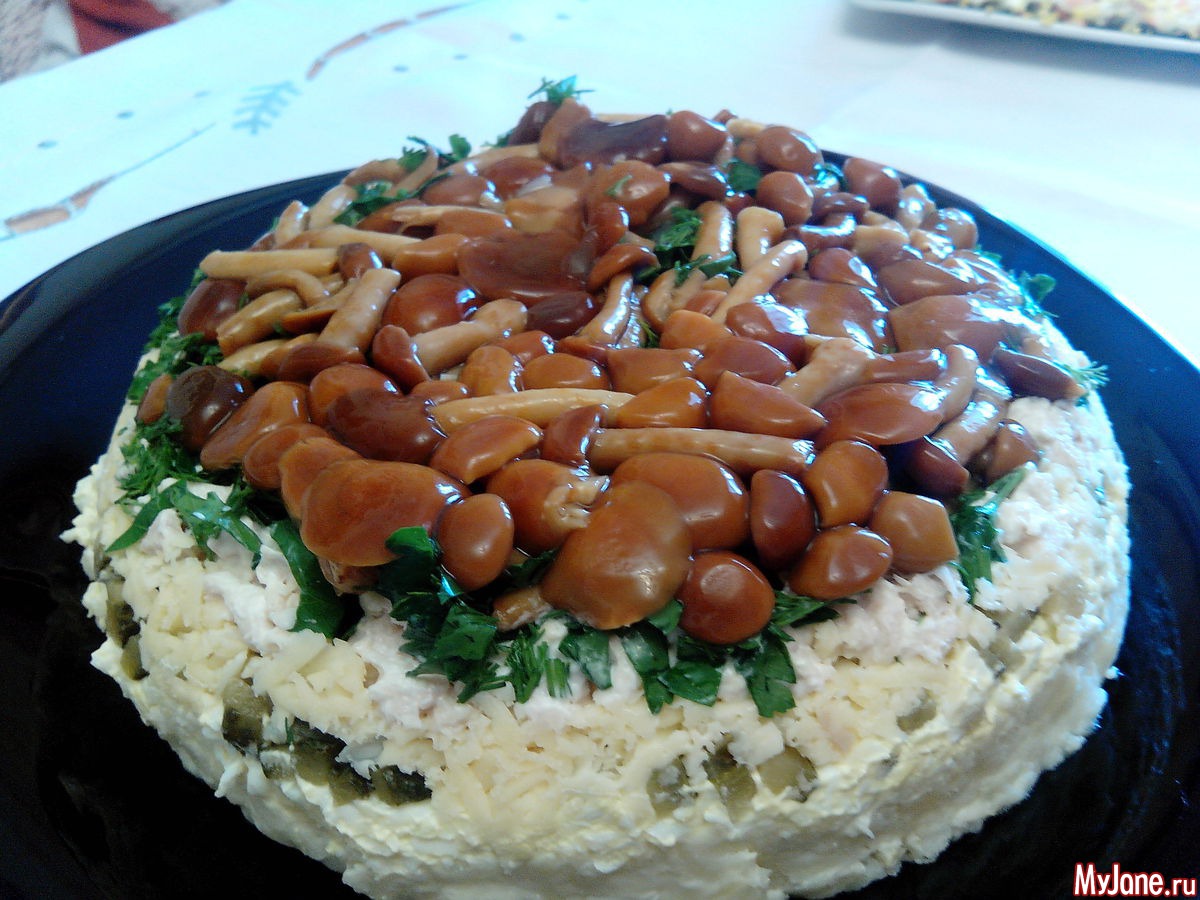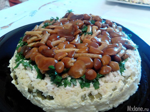 1-й слой - маринованные грибы (какие больше нравятся - шампиньоны, опята, ассорти...) шляпками вниз;