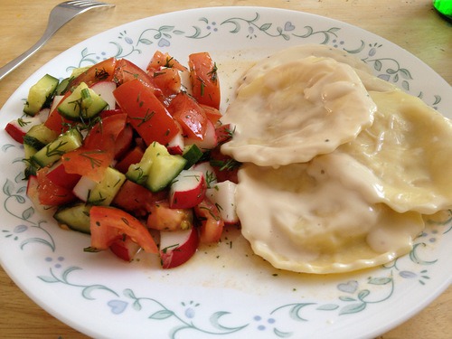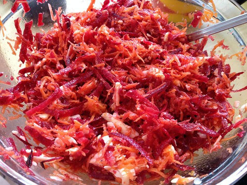 на обед я подсела вот на такой салатик - тёртая сырая свёкла, тёртая морковь, чеснок, тёртый сыр и немножко оливкового масла. вкуснятина. делаю себе несколько раз в неделю.