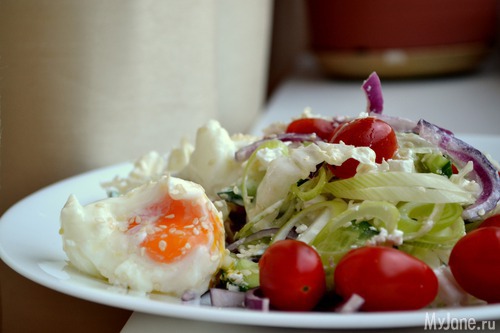 Салатик с обезжиренной фетой и яйцом в смятку. А мужу рисовая лапша с курицей и овощами.