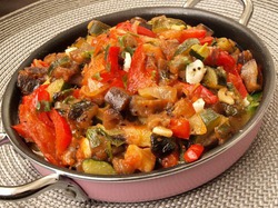 3. Добавить цуккини, сладкий перец, лук, чеснок. Подлить масло и еще немного обжарить овощи помешивая.