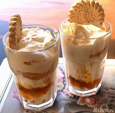 2. в стаканы выложить слоями мороженое, варенье, взбитые сливки.