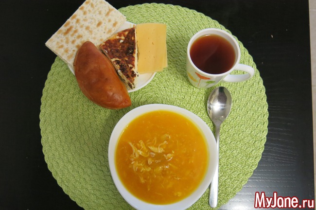 тыквенный суп-пюре с курицей, два хлебца, кусочек сыра, пирожок с капустой (последний