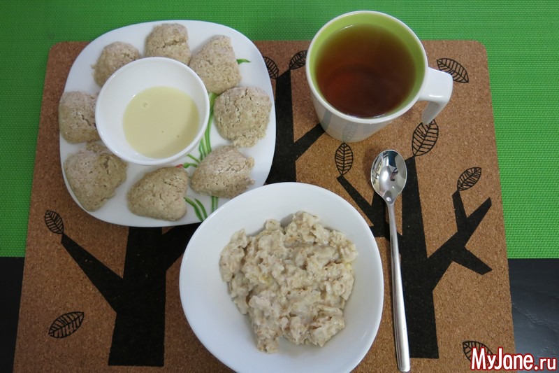 овсянка с сыром, ленивые вареники из творога с отрубями на пару, сгущенка, чай