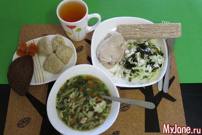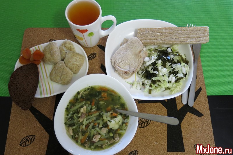 суп курино-овощной, хлеб, салат (капуста пекинская+сельдерей+морская капуста), индейка отварная, 2 хлебца, остатки вареников, курага, чай
