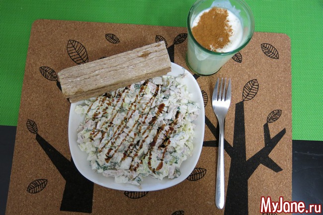 салат (индейка отварная+капуста пекинская+сельдерей+оливки+творог+соус бальзамический), 4 хлебца, кефир с корицей