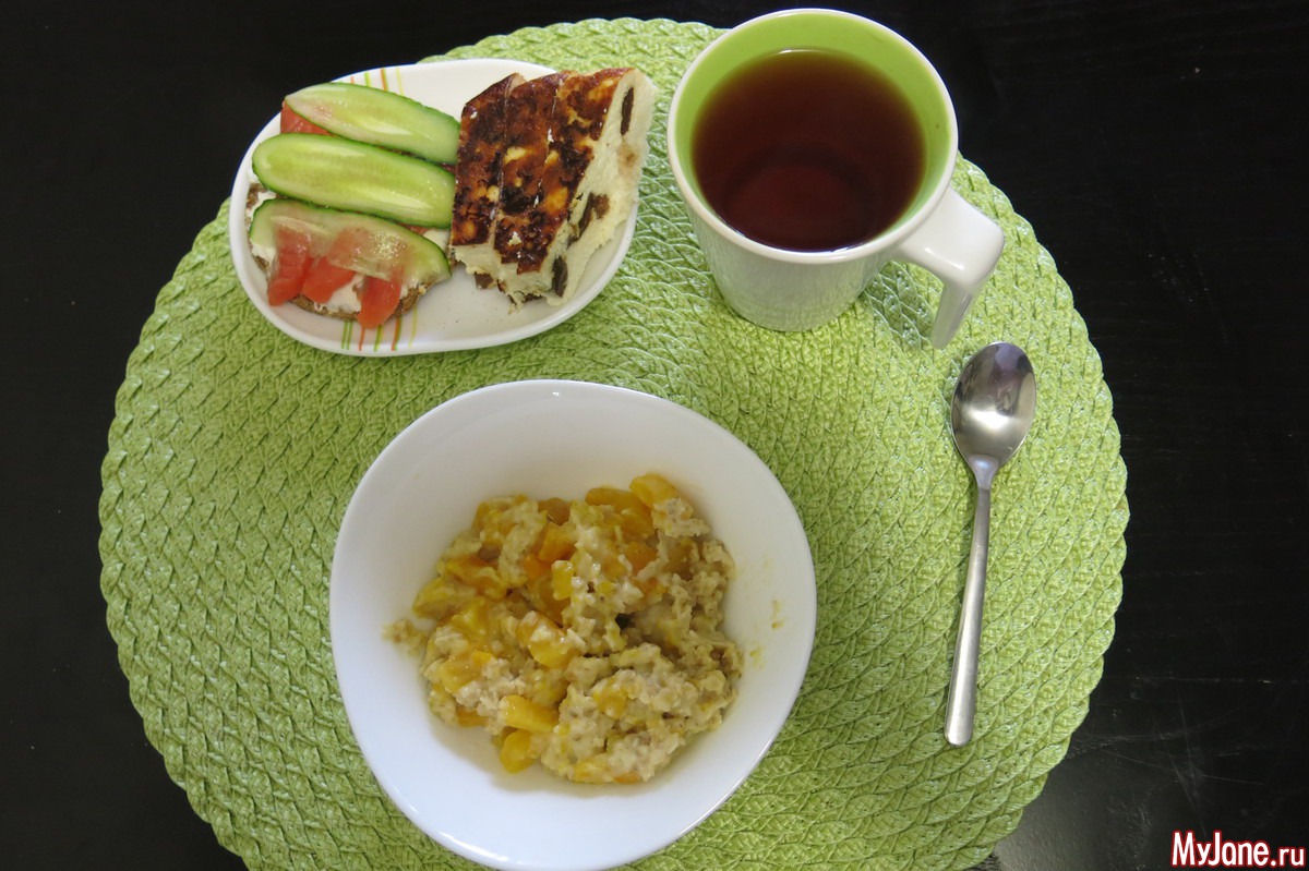 овсянка с тыквой, бутер с кр. рыбой (хлебец+рикотта+красная рыба+огурец), запеканка творожная, чай