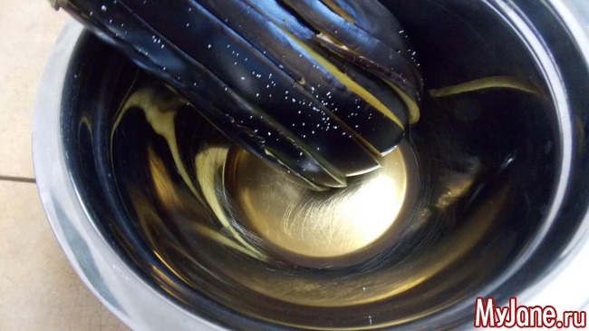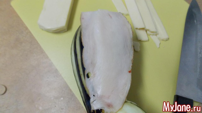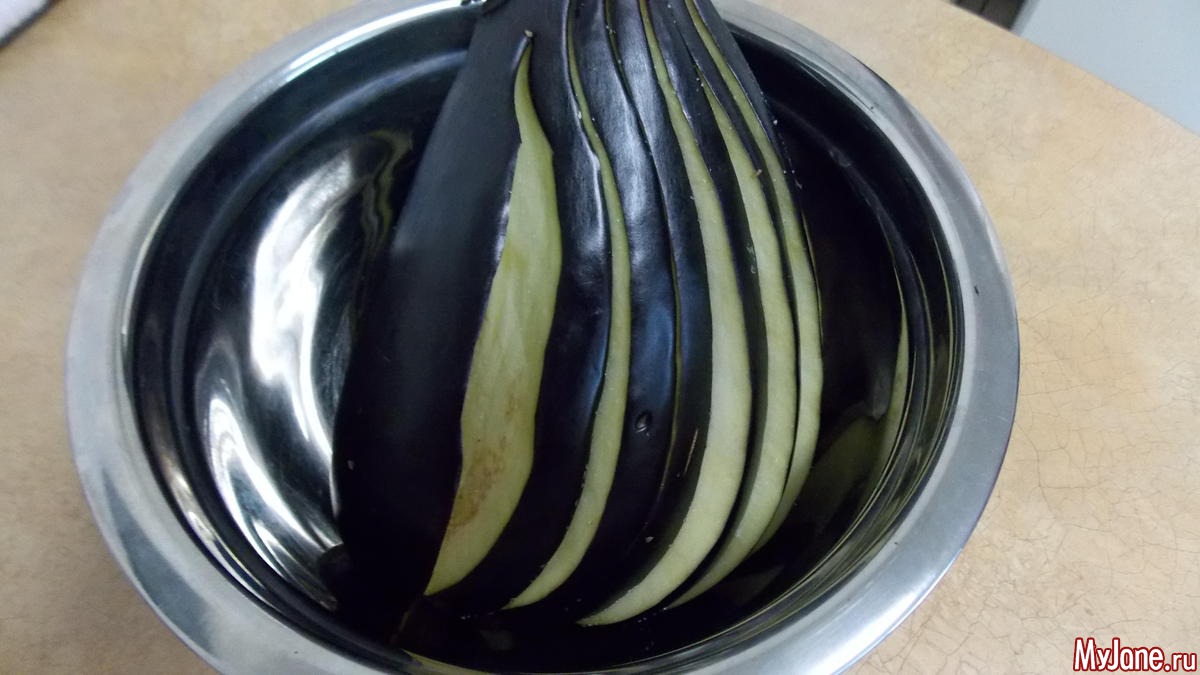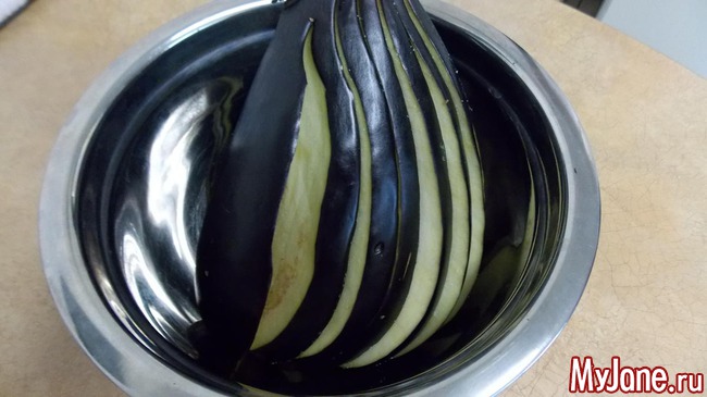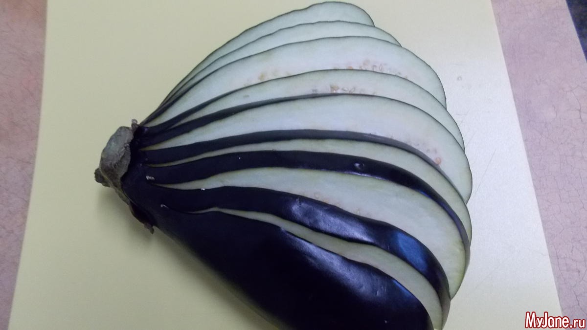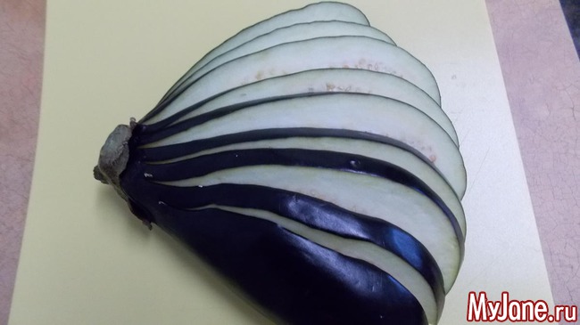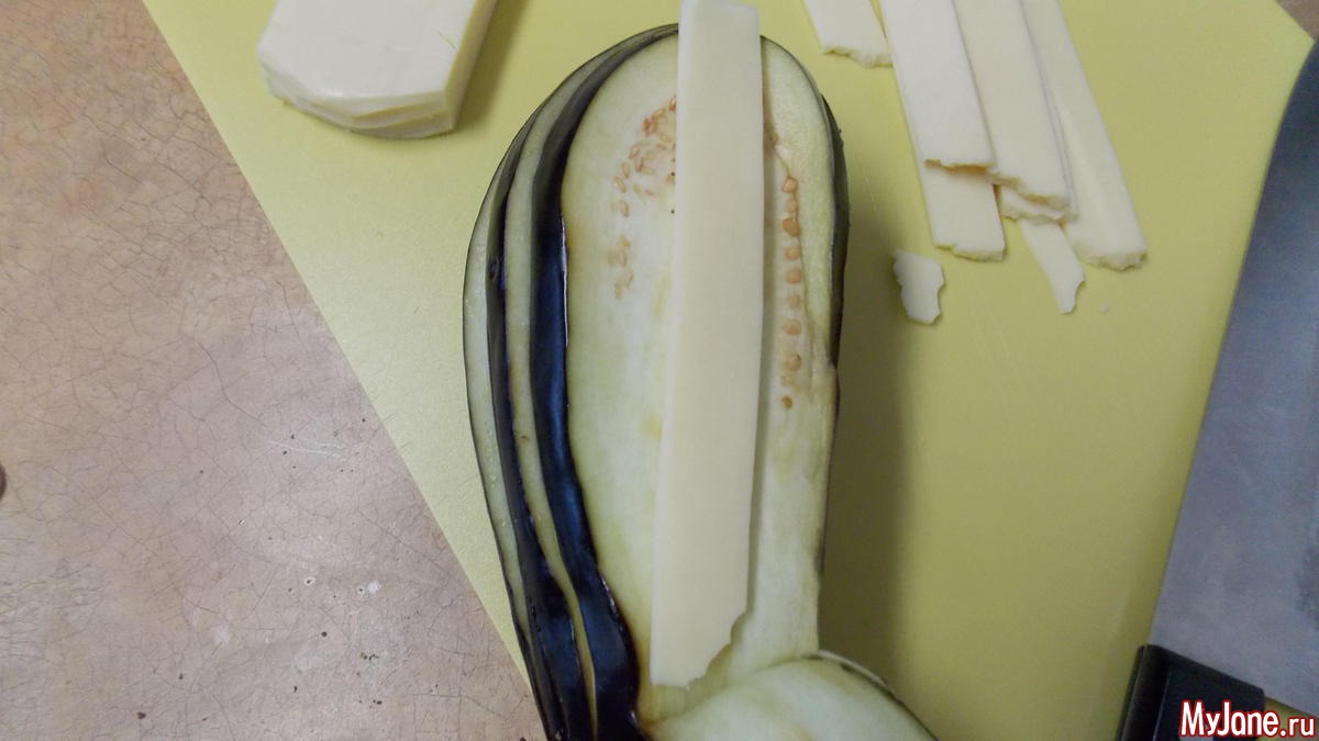 Берем наш несчастный баклажан и нарезаем его полосками по всей тушке.